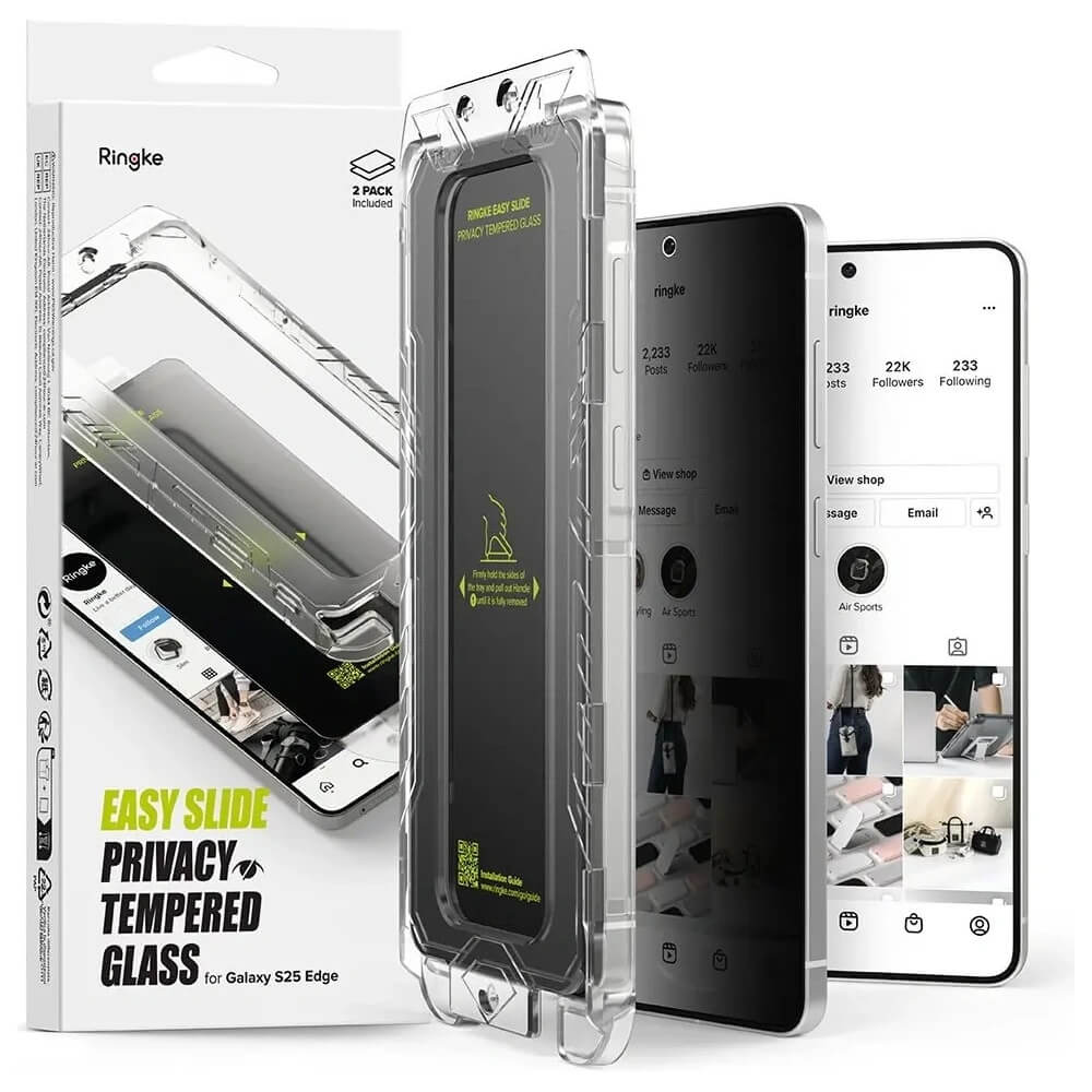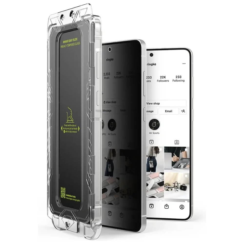 - Комплектът включва: 2 х Ringke Easy Slide Tempered Glass, 1 x рамка за поставяне, 1 x микрофибърна кърпичка, 1 x мокра кърпичка, 1 x антистатична лепенка