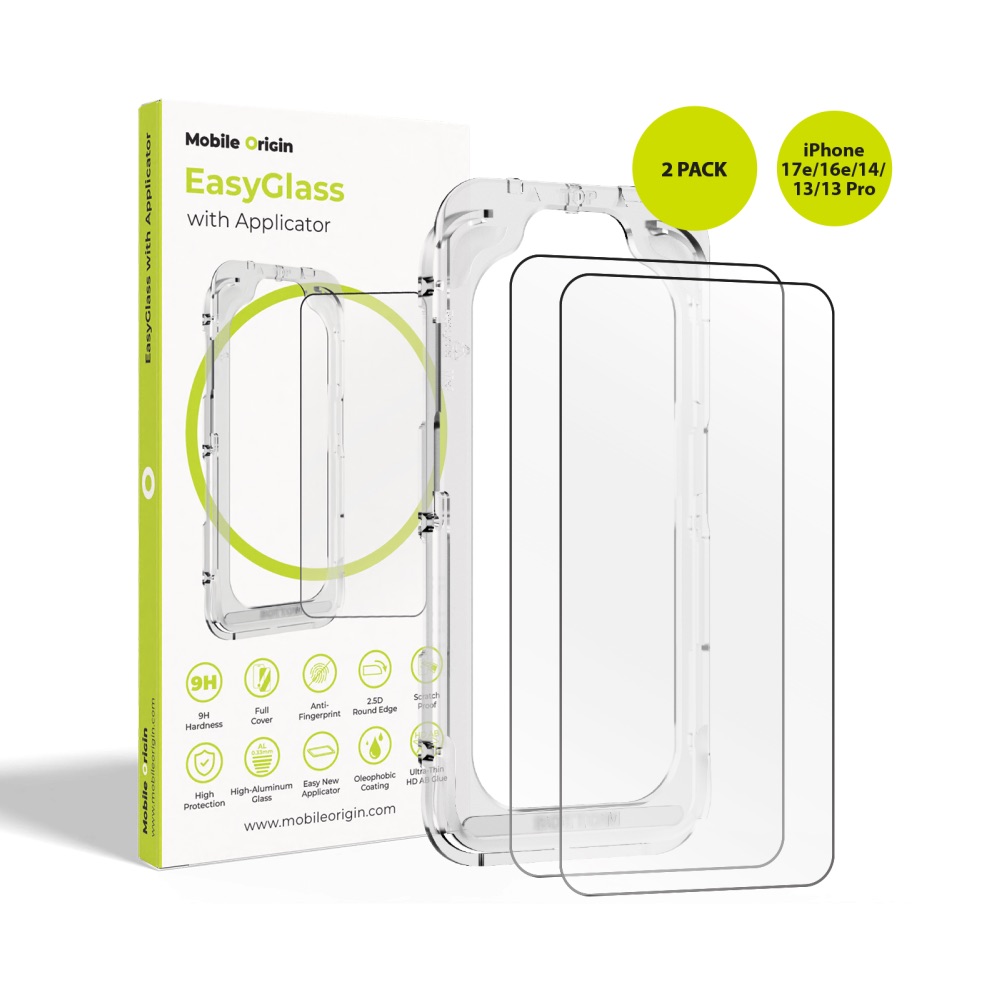 2 броя калени стъклени защитни покрития за дисплея на iPhone 17e, iPhone 16e, iPhone 14, iPhone 13, iPhone 13 Pro - Mobile Origin EasyGlass Full Cover Tempered Glass Pack With Applicator (черен-прозрачен)