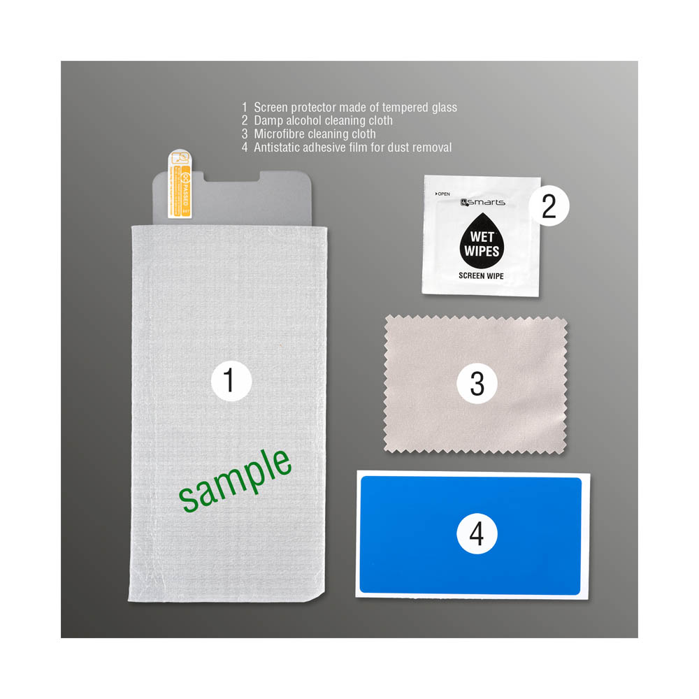 - 1 х 4smart Tempered Glass Protector - 1 x микрофибърна кърпичка - 1 х мокра кърпичка - 1 х антистатична лепенка за премахване на прашинки