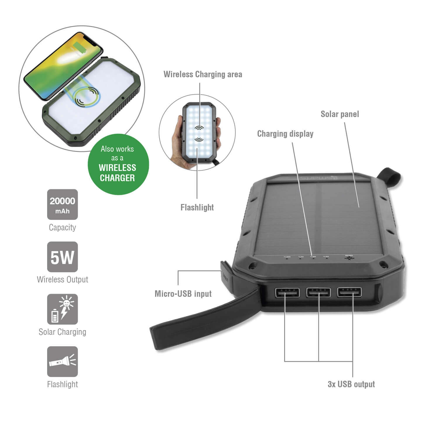 4smarts Solar Wireless Qi Power Bank TitanPack 20,000mAh - соларна удароустойчива външна батерия с безжично зареждане, три USB изхода и LED фенер