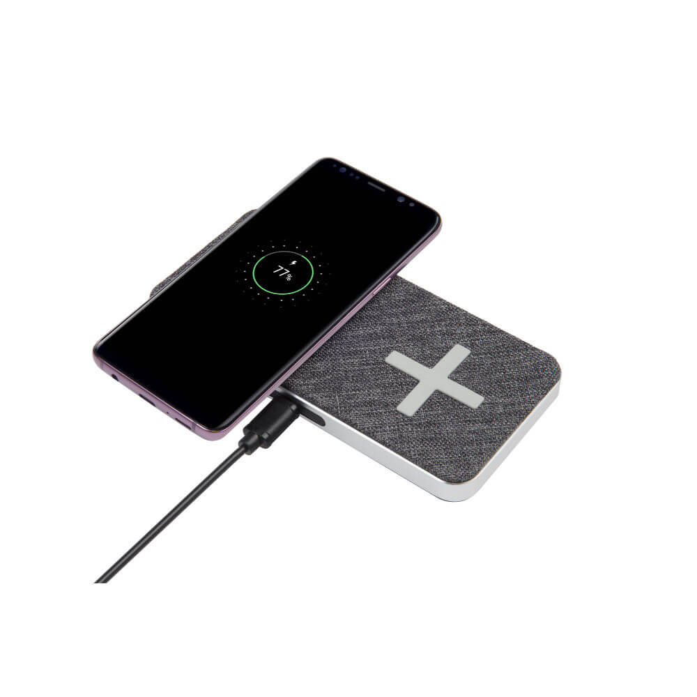 - Горната основа на поставка е поктита от канвас материал с противоплъзгаща се "плюс" маркировка, за да сте сигурни, че смартфонът ви е перфектно позициониран и не се плъзга по време на зареждането