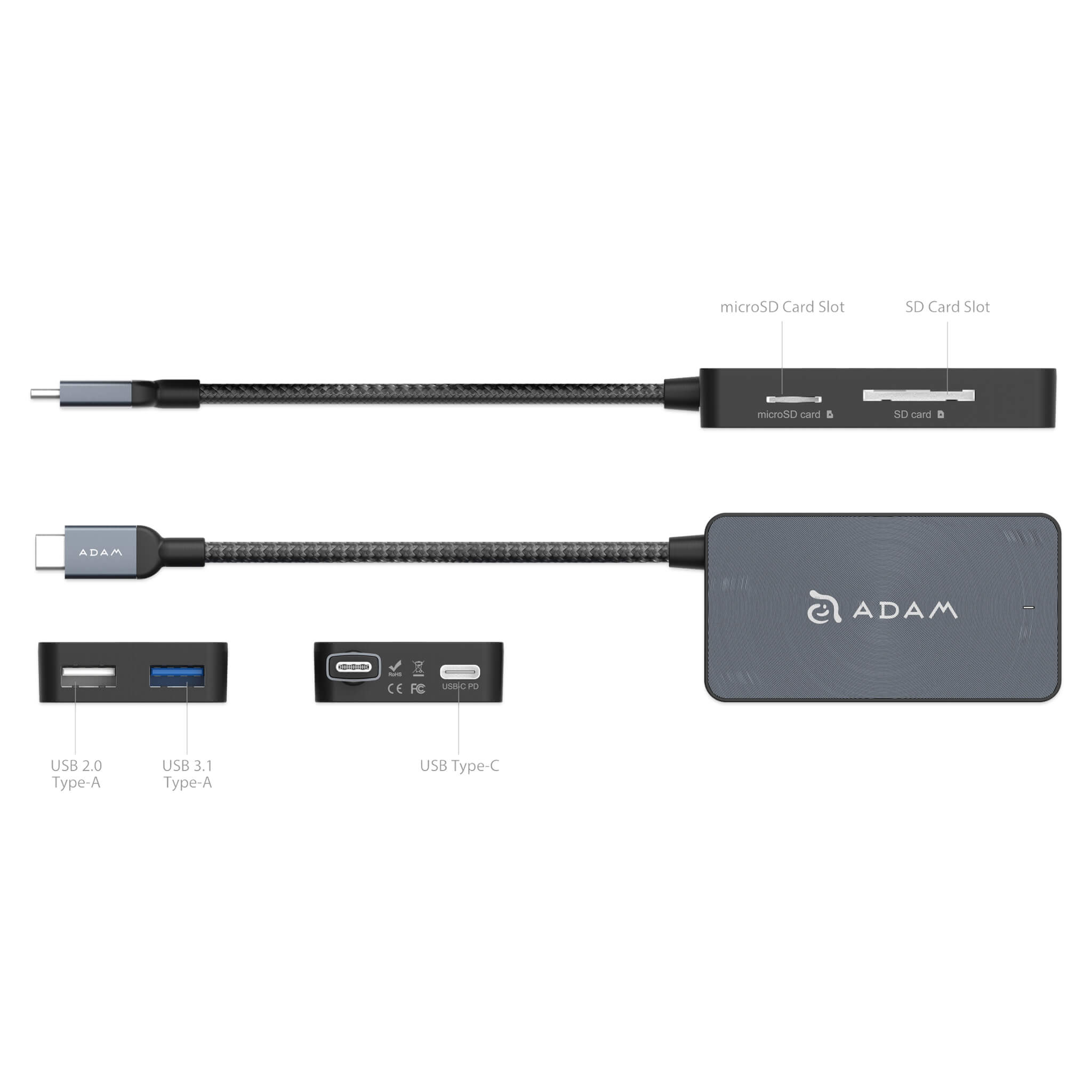 Adam Elements Casa Hub PDC501 - USB-C хъб с 2 USB изхода, USB-C порт и четец за карти памети за устройства с USB-C порт (сребрист)