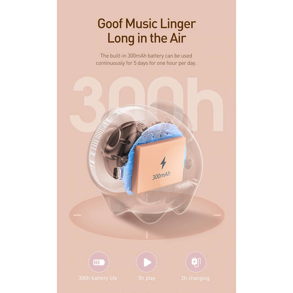 - Вградената 300mAh батерия осигурява до 5 часа възпроизвеждане на музика