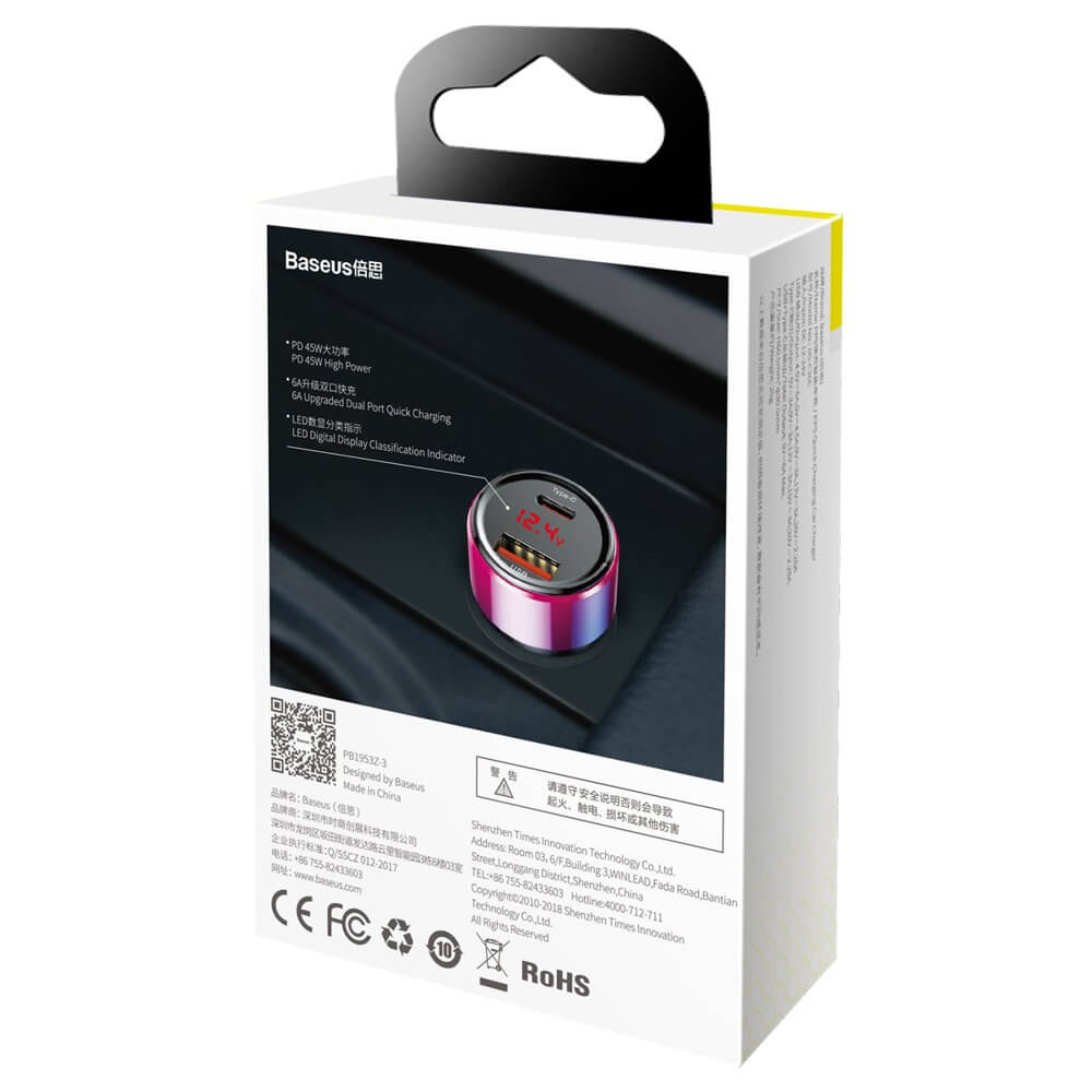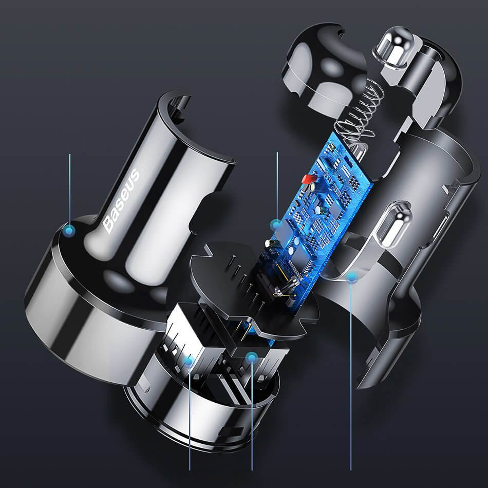 - Зарядно за кола с един USB изход и един USB-C, като и двата притежават технология за бързо зареждане QualComm Quick Charge 4.0 (QC 4.0)