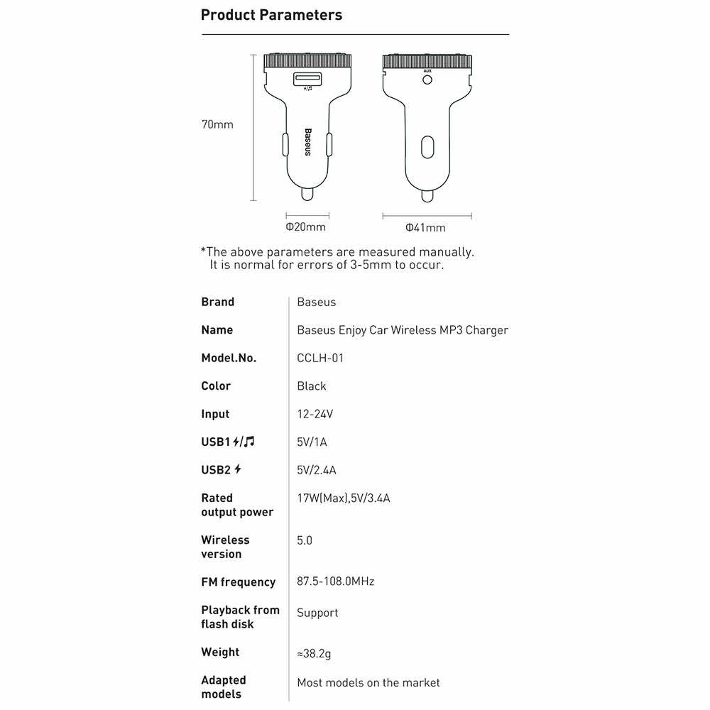 Baseus Enjoy Bluetooth FM Transmitter (CCLH-01) - блутут FM трансмитер с AUX и зарядно за кола за мобилни устройства (черен)