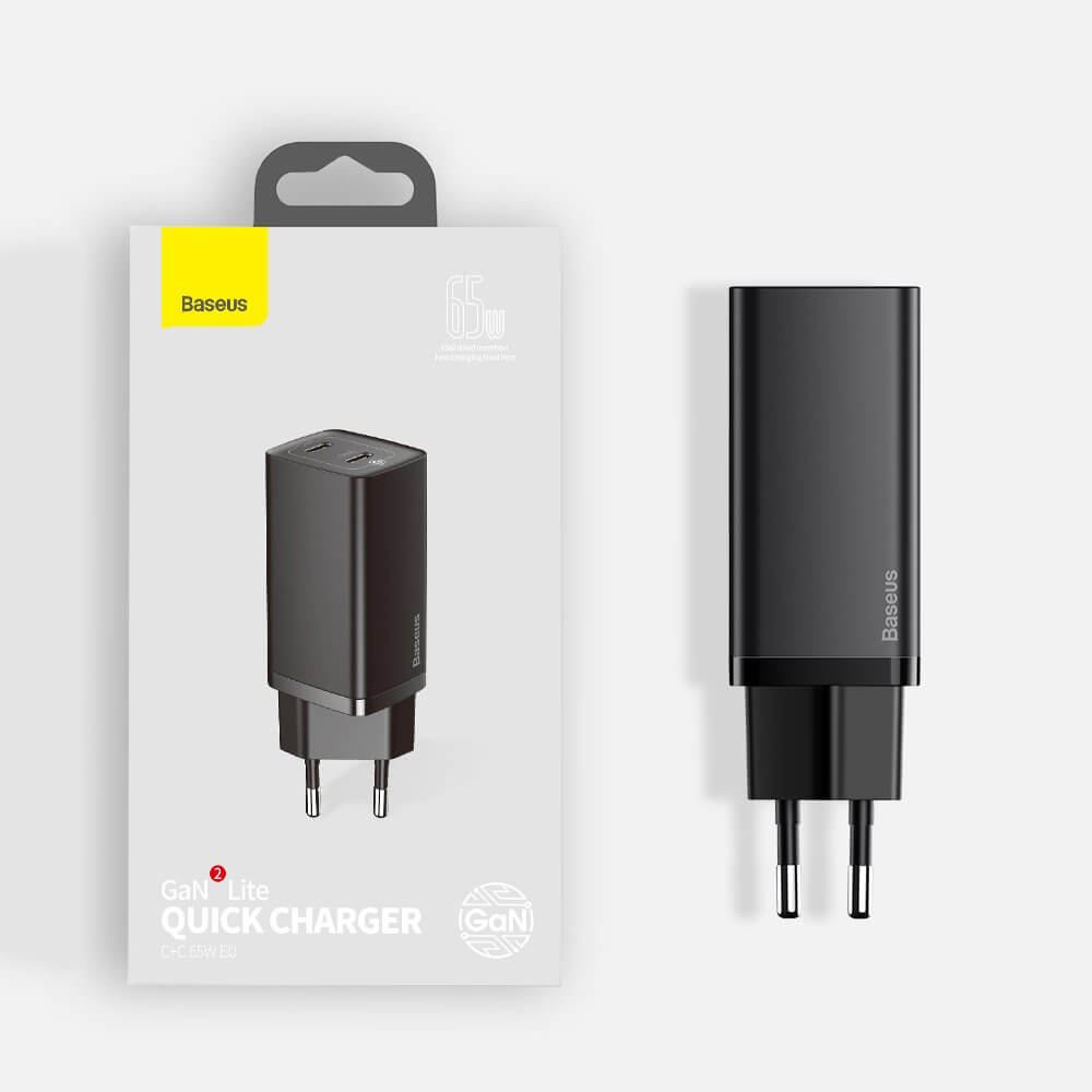 Baseus GaN 2 Lite Charger 65W (CCGAN2L-E01) - захранване за ел. мрежа за лаптопи, смартфони и таблети с 2xUSB-C изхода и с технология за бързо зареждане (черен)