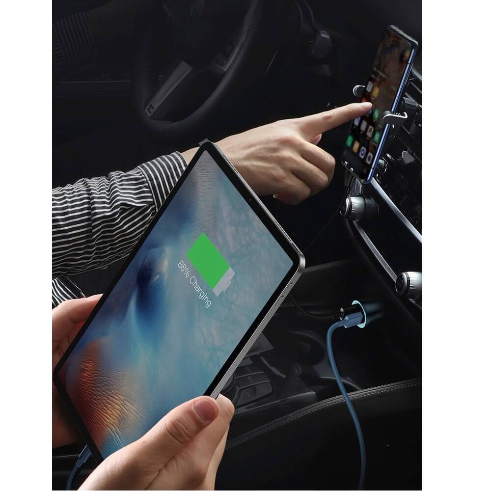 - Зарядно за кола с USB и USB-C изходи, като и двата притежават технология за бързо зареждане
