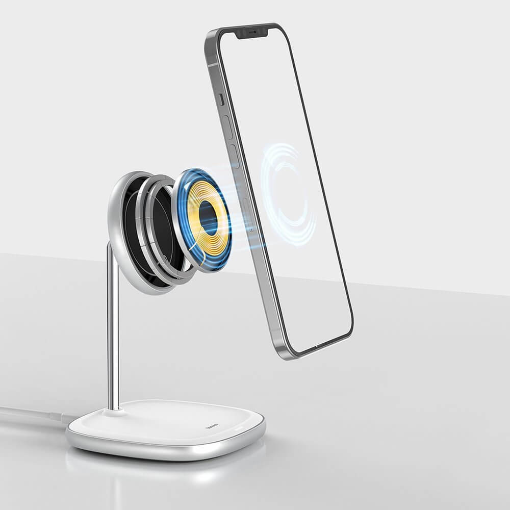 - Магнитна приставка с вграден модул за безжично зареждане - зарежда бързо вашия iPhone 12 с мощност до 15W чрез удобната му магнитна връзка, която се прикрепва към вашия смартфон. Стойката позволява удобно гледане и лесно регулиране на перфектния ъгъл