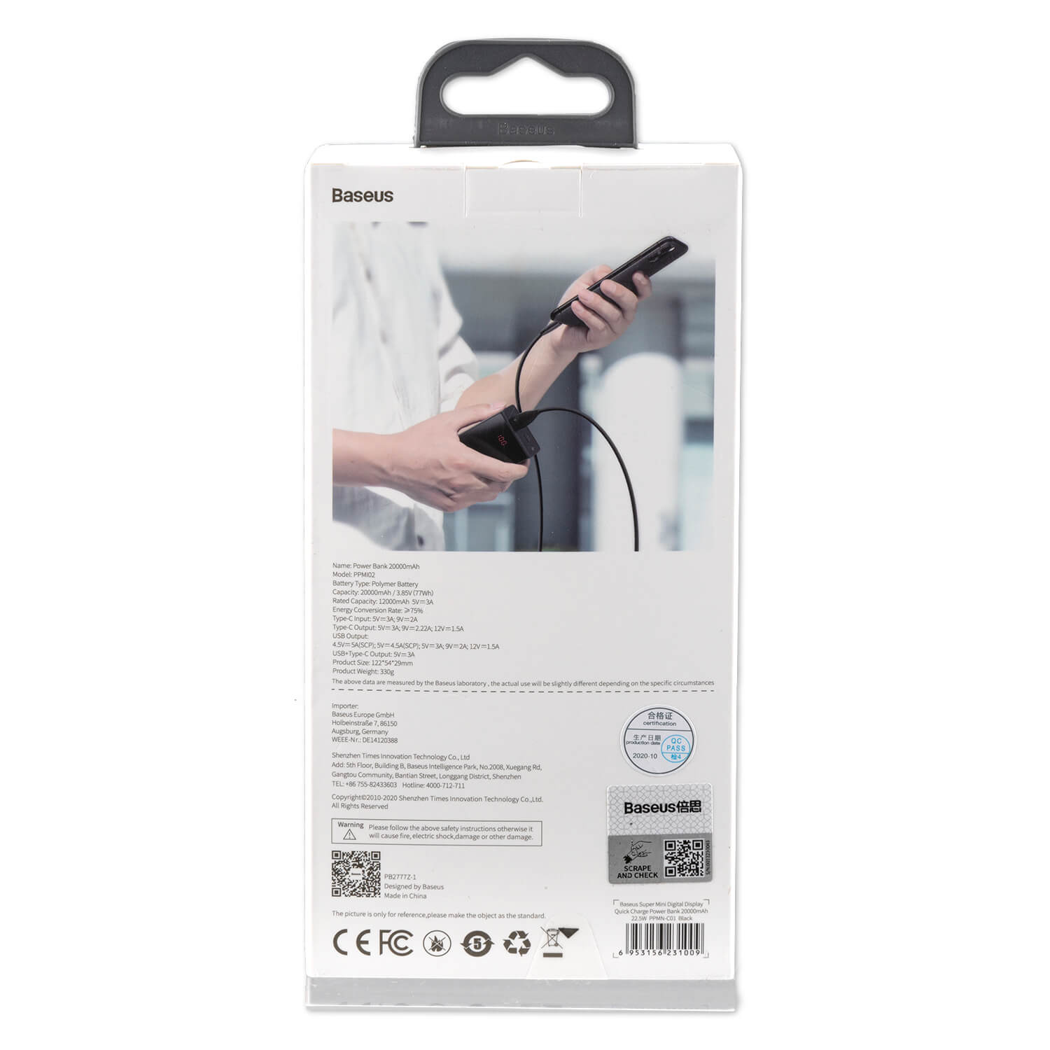 - 1 x Baseus Super Mini 22.5W Power Bank 20000mAh - 1 x Baseus USB-A към USB-C кабел (100 см) - 1 х ръководство
