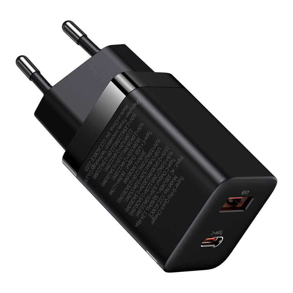 Baseus Super Si Pro Quick Wall Charger 30W (CCSUPP-E01) - захранване за ел. мрежа с USB и USB-C изходи и технология за бързо зареждане (черен)