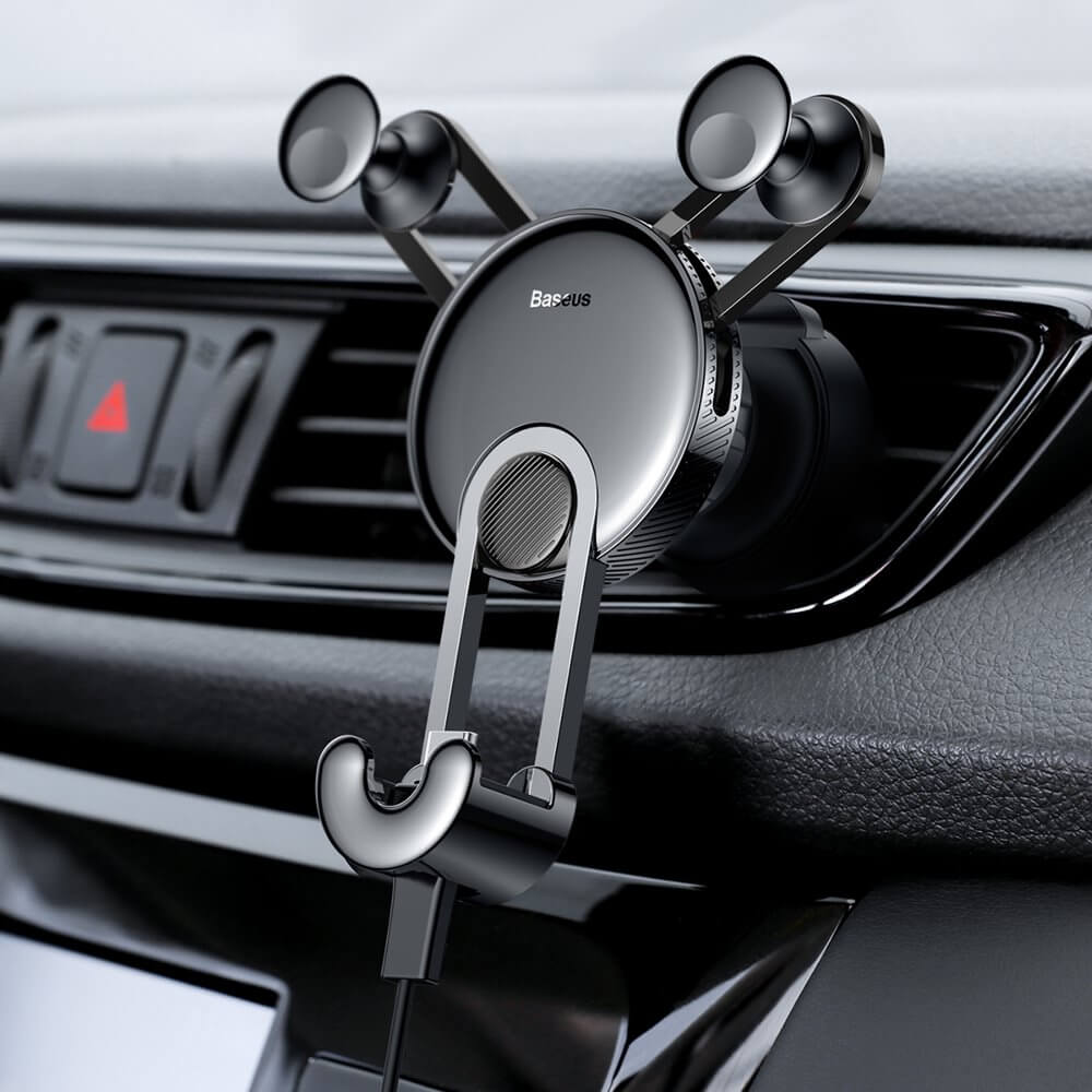 Baseus YY Car Mount Holder - поставка за радиатора на кола за смартфони с дисплеи до 6.5 инча и Lightning кабел (100 см) (черна)