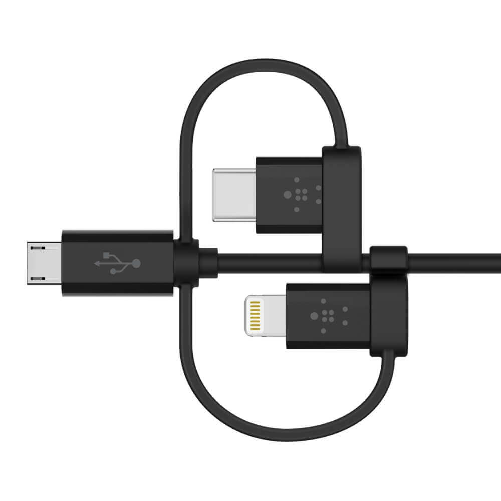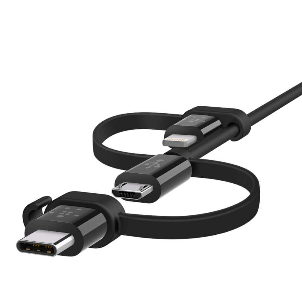 Belkin Universal Cable with Micro-USB, USB-C and Lightning Connectors - качествен USB кабел с Lightning, microUSB и USB-C конектори (черен)