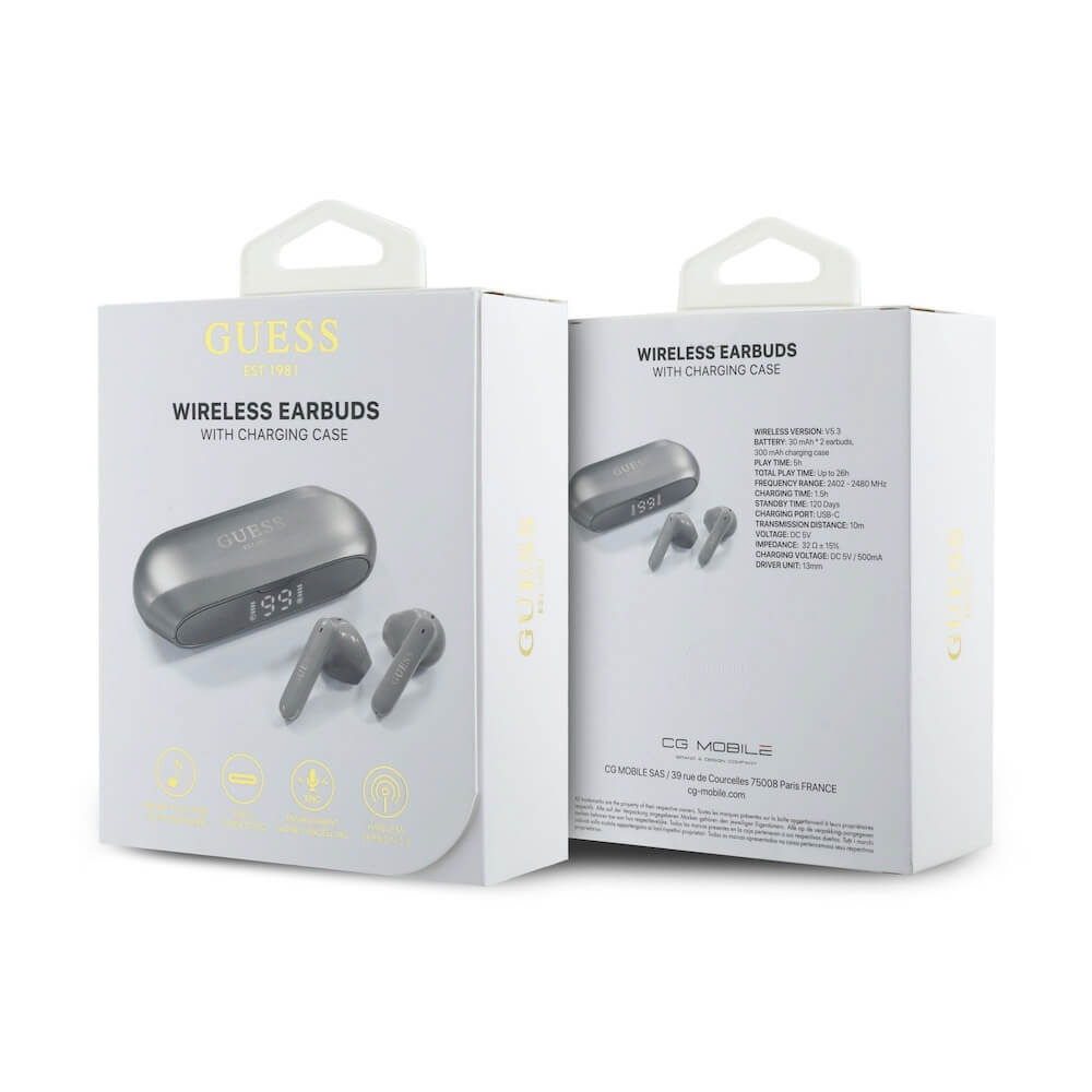 - В комплекта: - 1 x Guess Elongated Metallic ENC Stereo TWS Headset - 1 x кейс за зареждане - 1 х ръководство за употреба