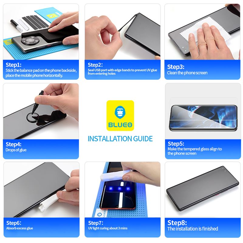 - 6. Използвайки UV лампата, изпечете лепилото, за да залепне стъкление протектор здраво върху дисплея на вашето устройство