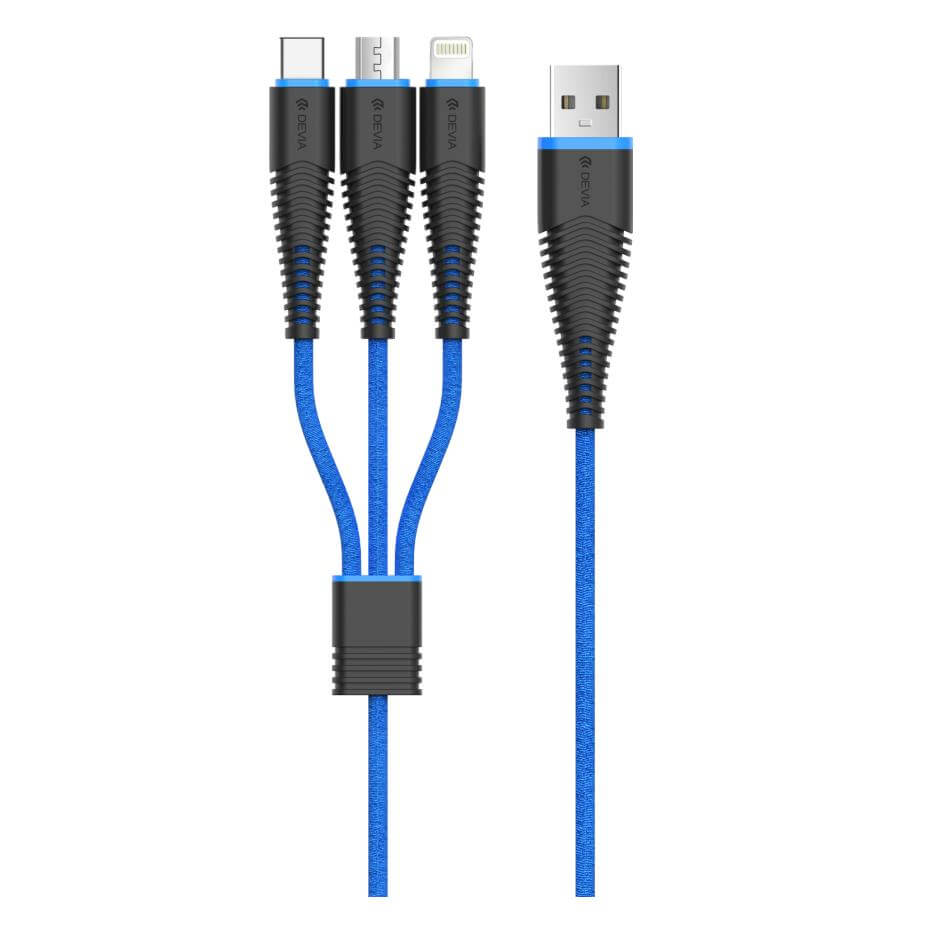 Devia FishBone 3 in 1 Cable - универсален качествен кабел с Lightning, MicroUSB и USB-C конектори (черен-син)