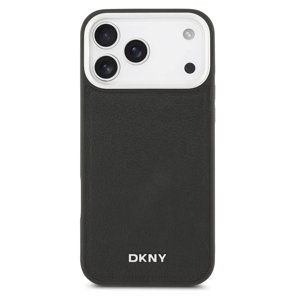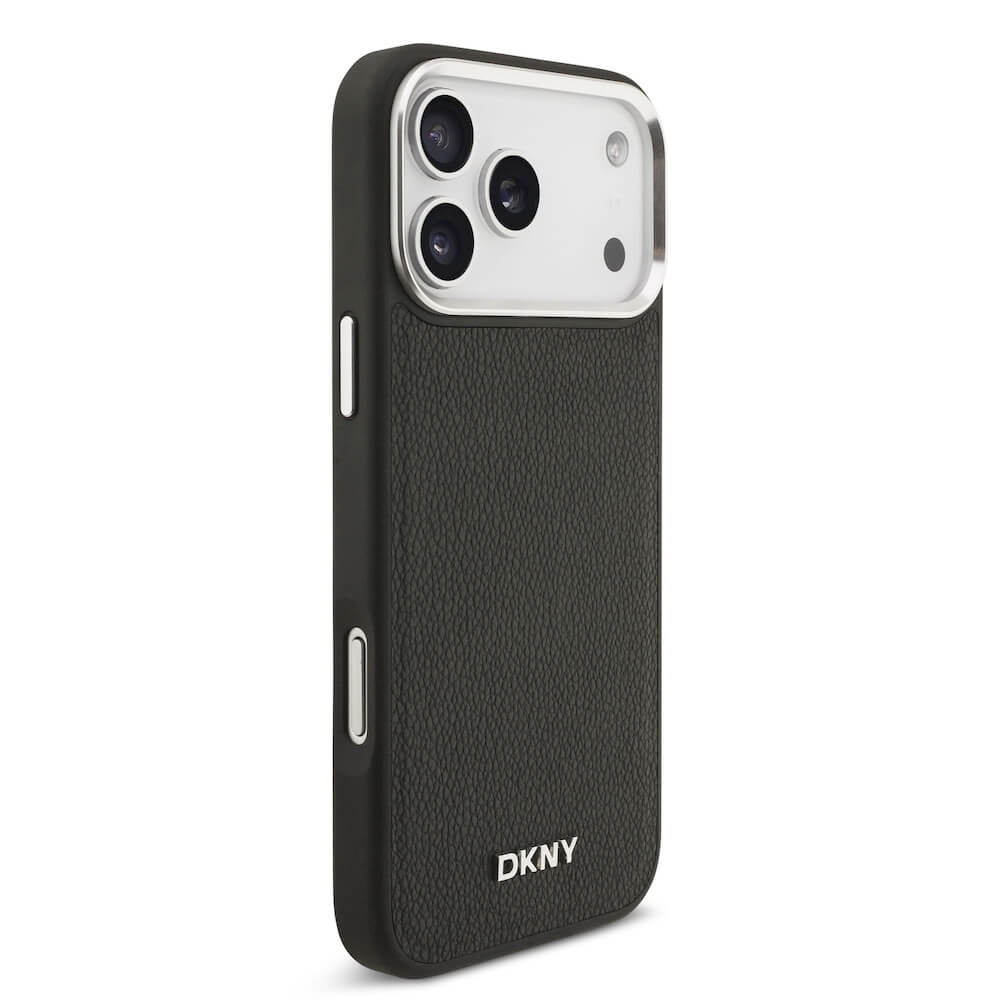 Дизайнерски кожен кейс с MagSafe и връзка за носене за iPhone 17 Pro Max - DKNY PU Leather Metal Logo Wrist Chain MagSafe Case (черен)