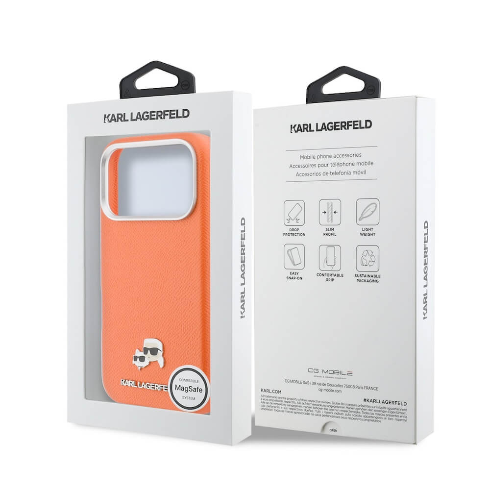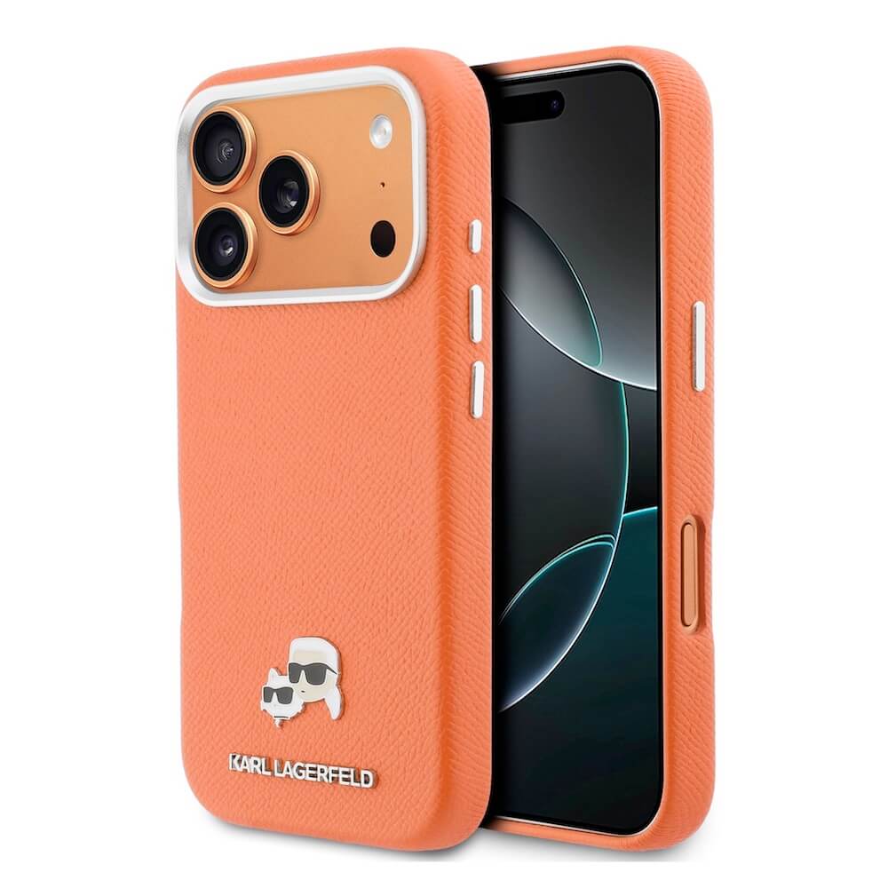 Дизайнерски кожен кейс с MagSafe за iPhone 17 Pro - Karl Lagerfeld PU Saffiano Karl and Choupette Heads Pins MagSafe Case (оранжев)