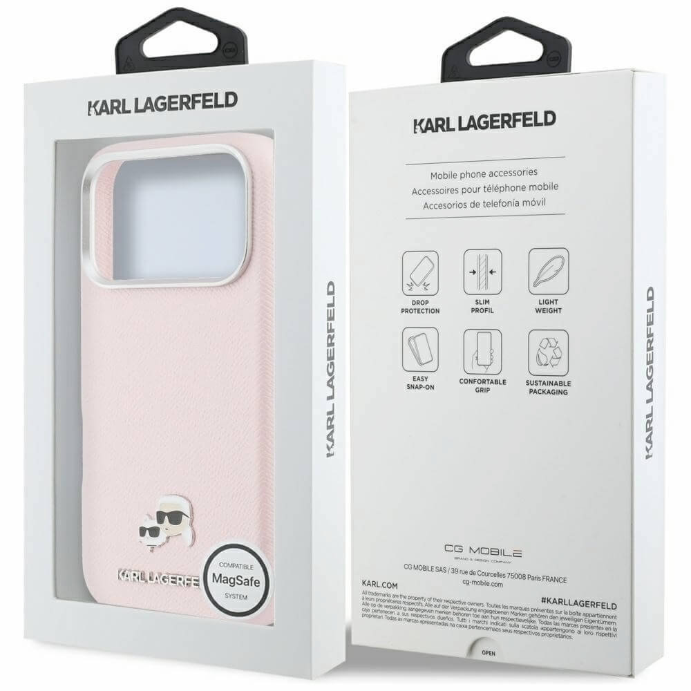Дизайнерски кожен кейс с MagSafe за iPhone 17 Pro Max - Karl Lagerfeld PU Saffiano Karl and Choupette Heads Pins MagSafe Case (розов)