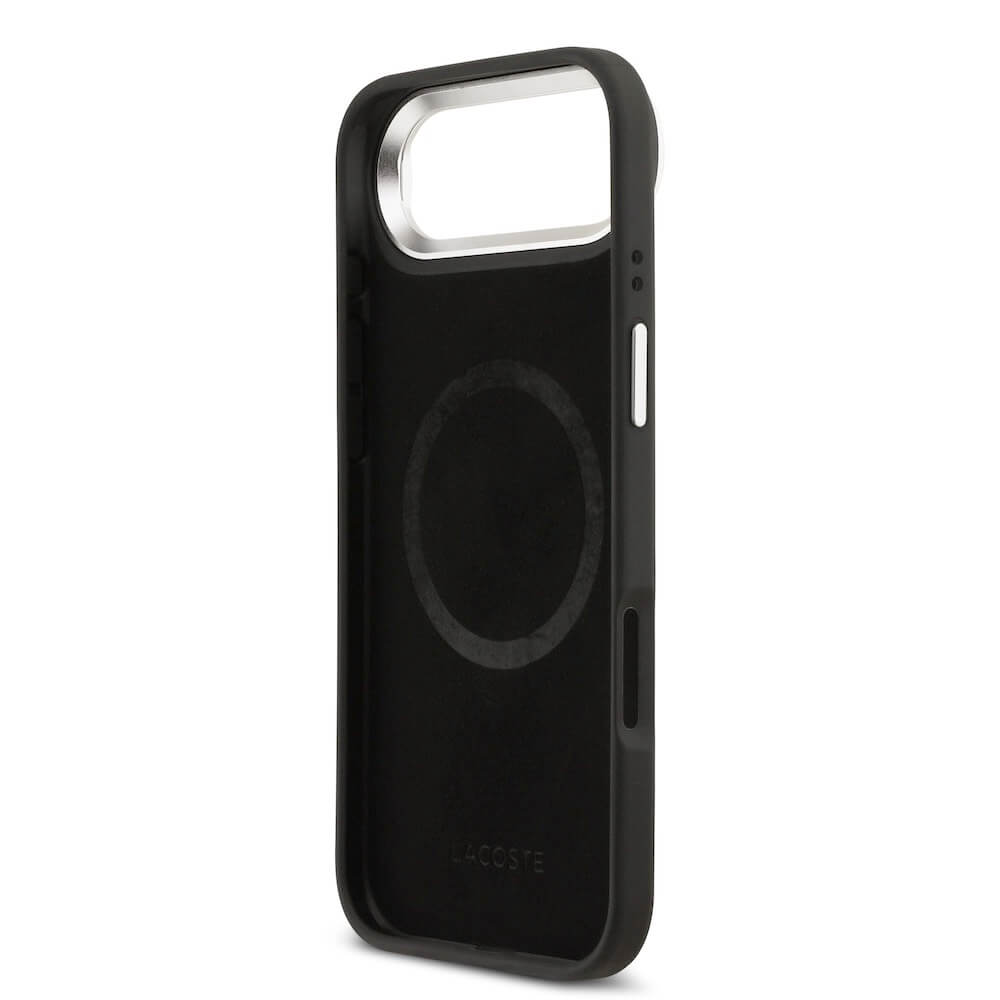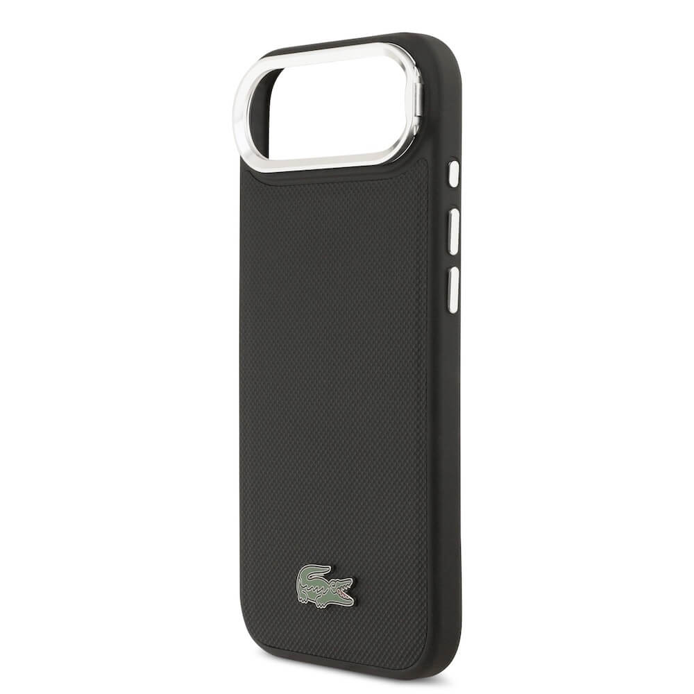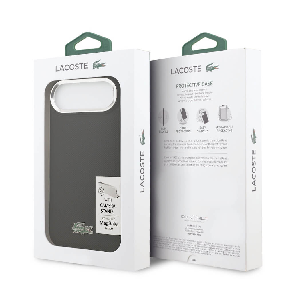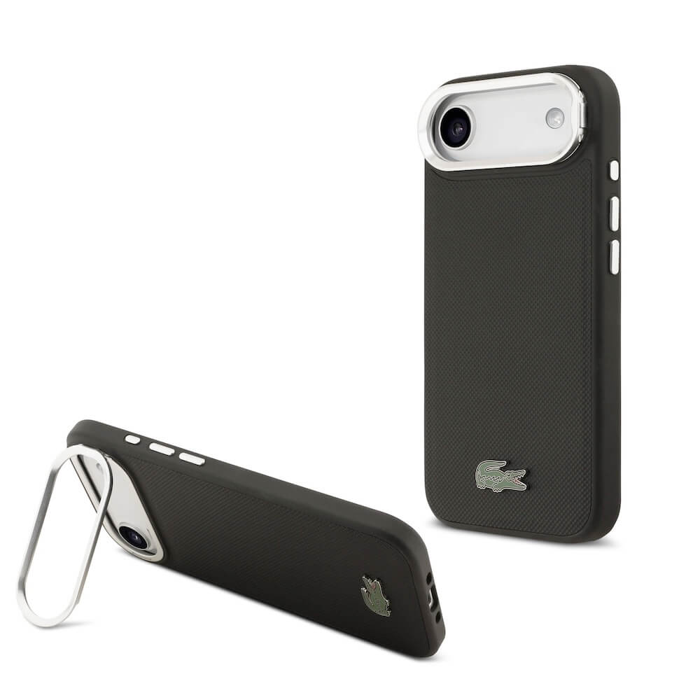 Дизайнерски кожен кейс с вградена поставка и MagSafe за iPhone 17 Air - Lacoste Iconic Petit Pique Camera Stand MagSafe Case (черен)
