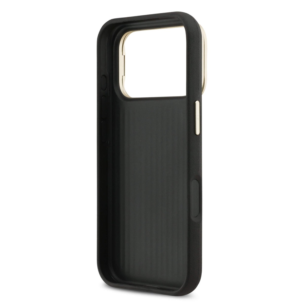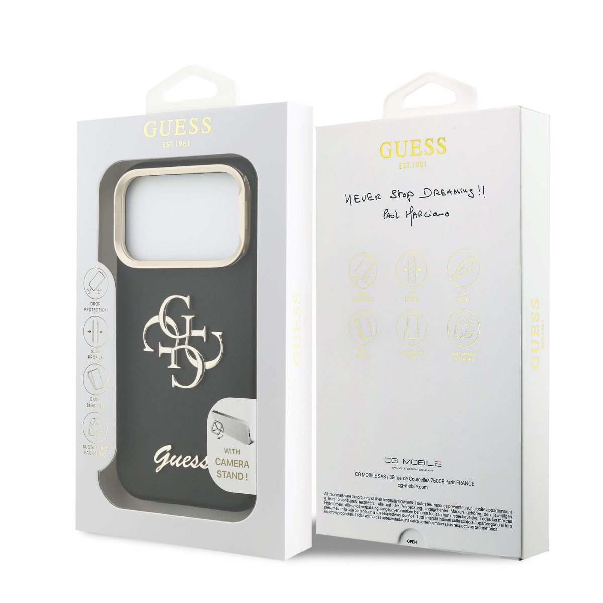 Дизайнерски кожен кейс с вградена поставка за iPhone 17 Pro - Guess PU Grained 4G Logo Stand Camera Frame Case (черен)