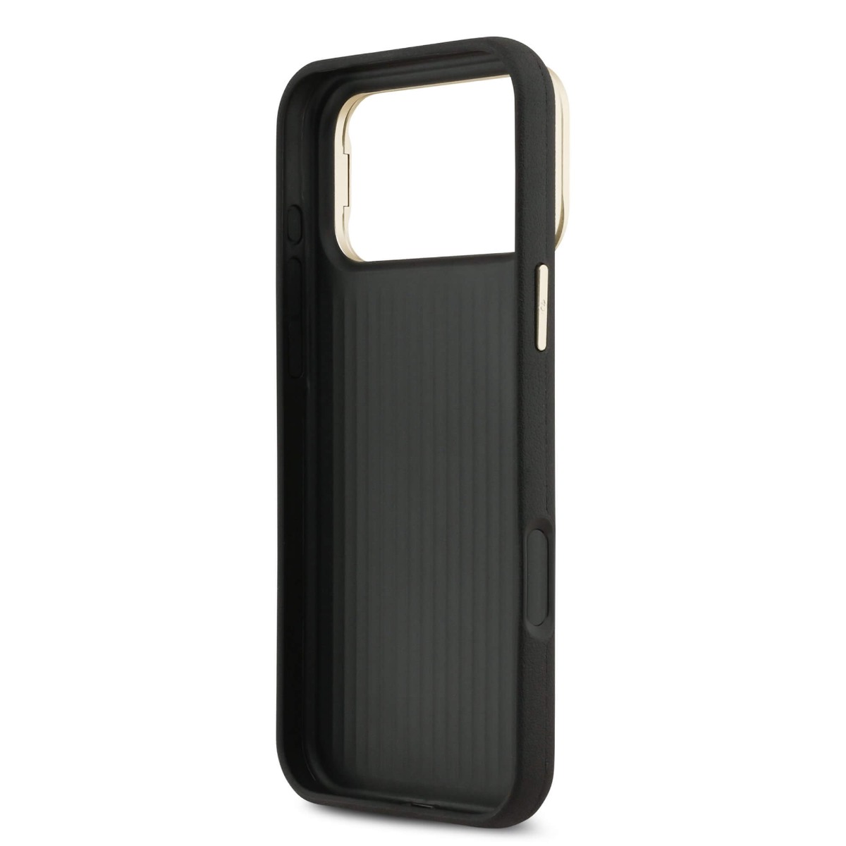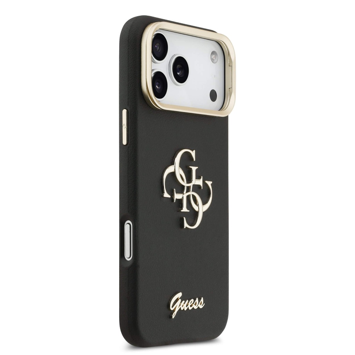 Дизайнерски кожен кейс с вградена поставка за iPhone 17 Pro Max - Guess PU Grained 4G Logo Stand Camera Frame Case (черен)