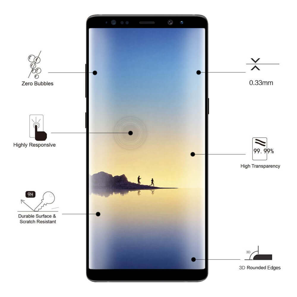§ Защитно покритие изработено от калено стъкло с извити ръбове, което обхваща целия дисплей на Samsung Galaxy Note 8