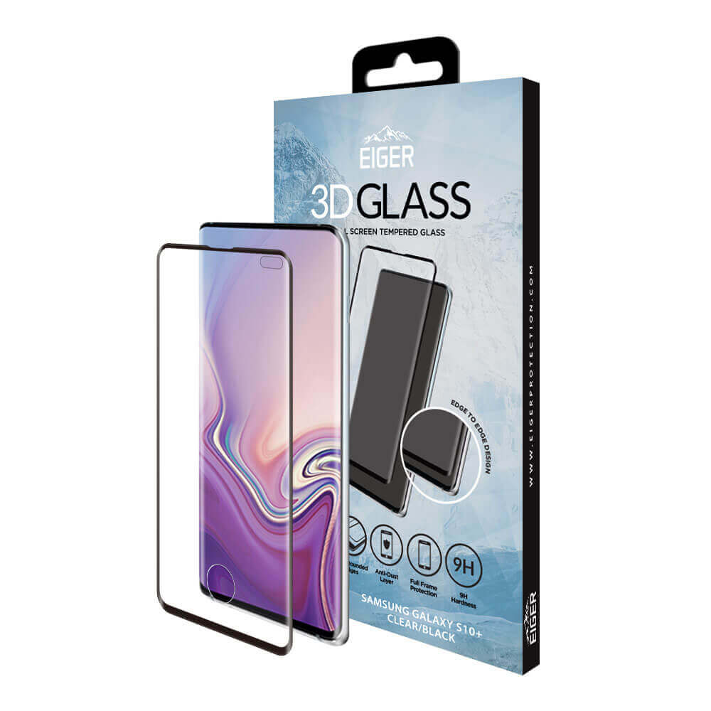 Eiger 3D Glass Edge to Edge Full Screen Tempered Glass - калено стъклено защитно покритие с извити ръбове за целия дисплея на Samsung Galaxy S10 Plus (черен-прозрачен)