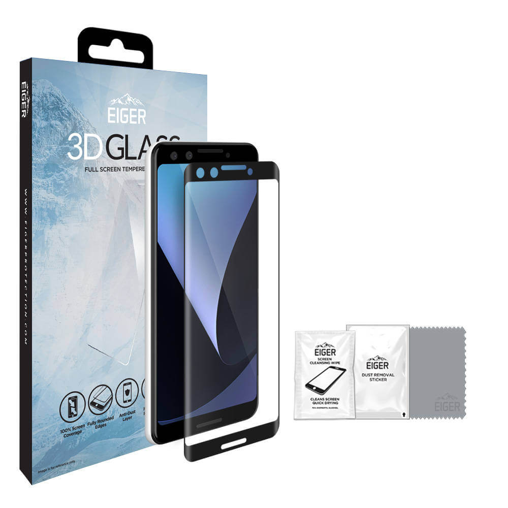 Eiger 3D Glass Full Screen Tempered Glass Screen Protector - калено стъклено защитно покритие с извити ръбове за целия дисплей на Google Pixel 3 XL (черен-прозрачен)