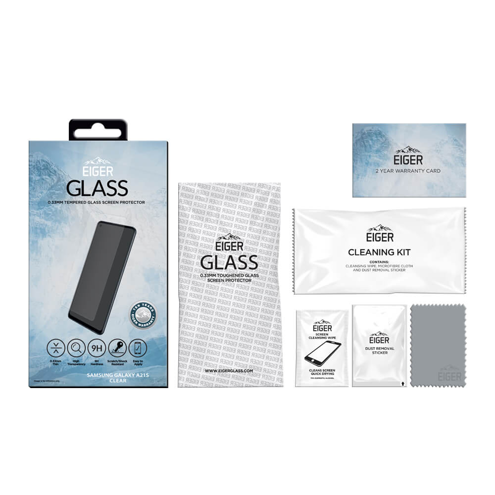 - 1 х Eiger ‘Asahi’ Tempered Glass Protector - 1 x микрофибърна кърпичка - 1 х мокра кърпичка - 1 х антистатична лепенка за премахване на прашинки