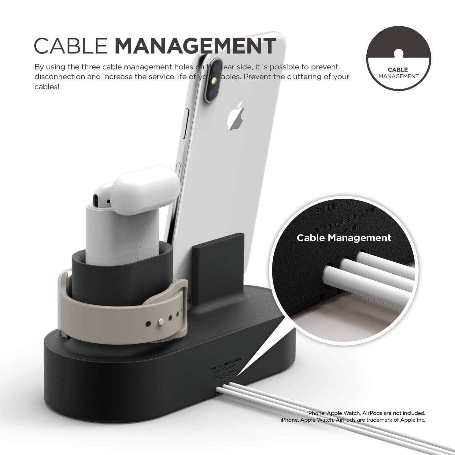 § Силиконовата поставка позволява да организираш кабелите прилежно, за да не се заплитат (съвместима е само с оригинални Apple кабели или кабели на Elago)