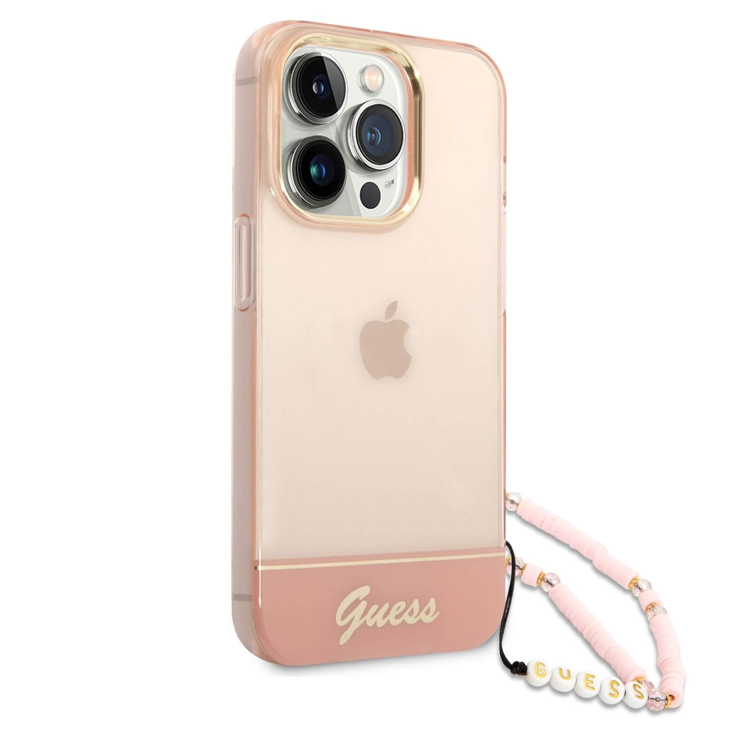 Guess Camera Outline Case with Strap - дизайнерски кейс с висока защита и с връзка за iPhone 14 Pro Max (розов)