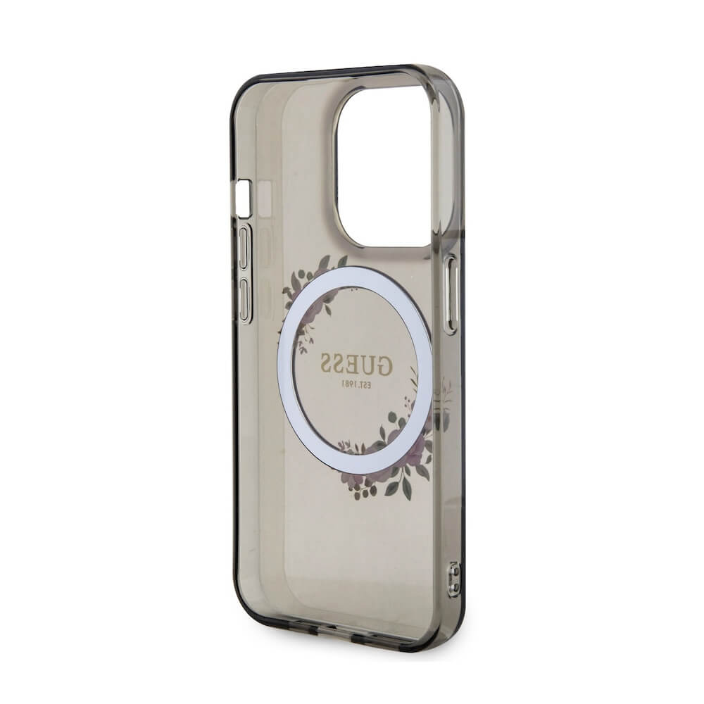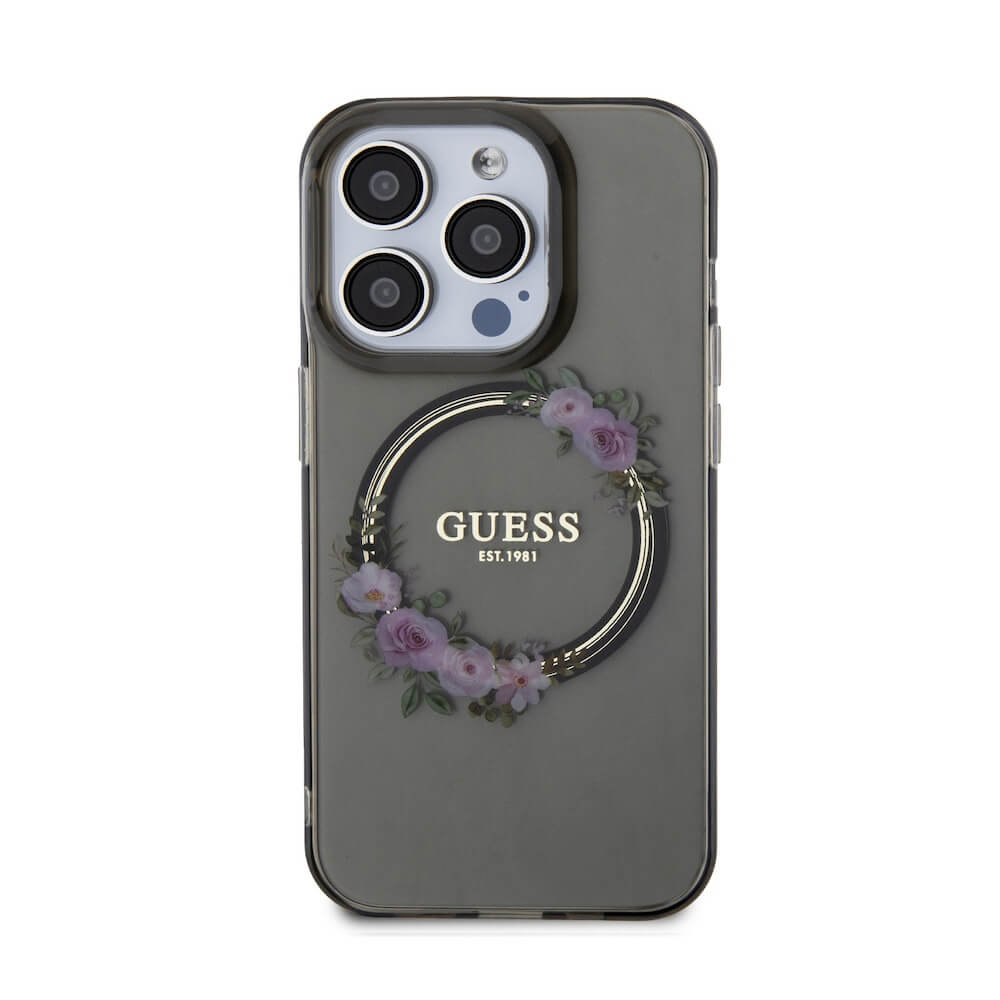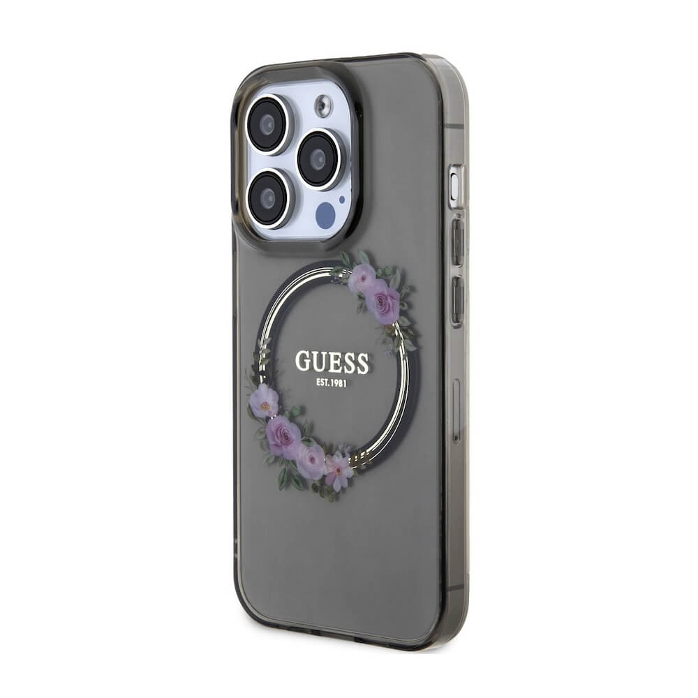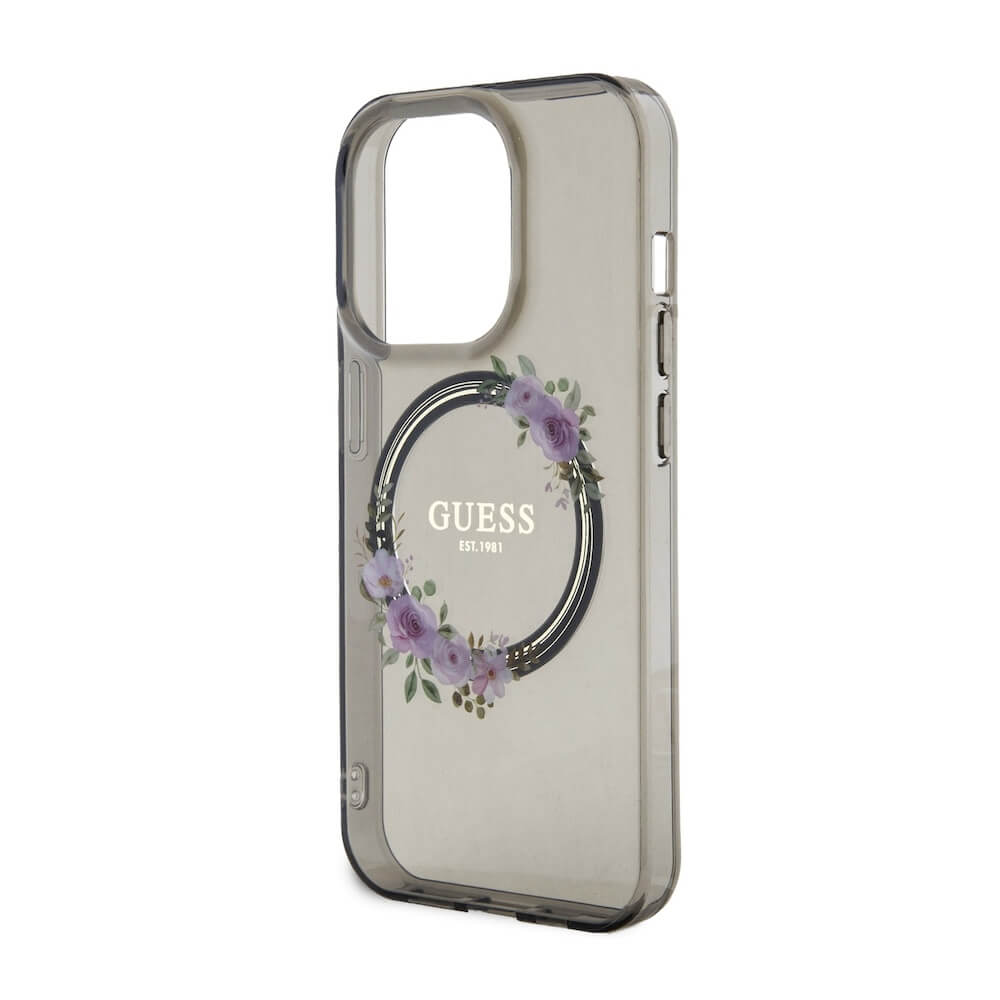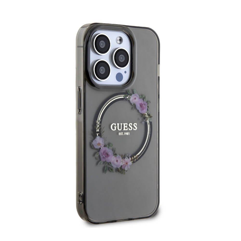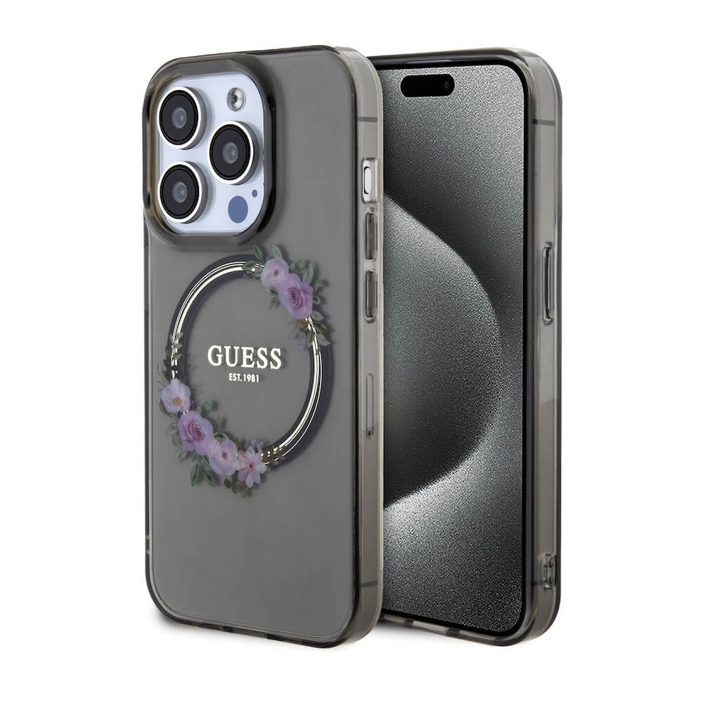 Guess Flowers Ring Glossy Logo MagSafe Case - хибриден удароустойчив кейс с MagSafe за iPhone 15 Pro (черен-прозрачен)