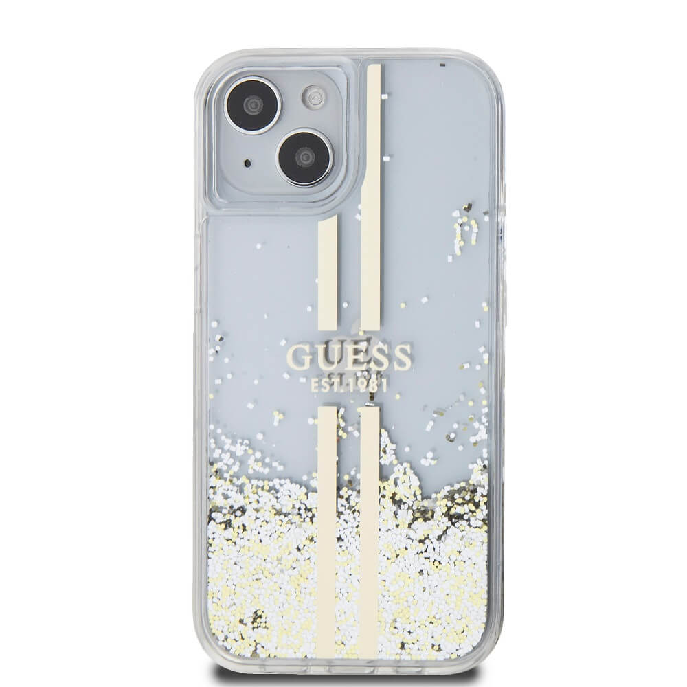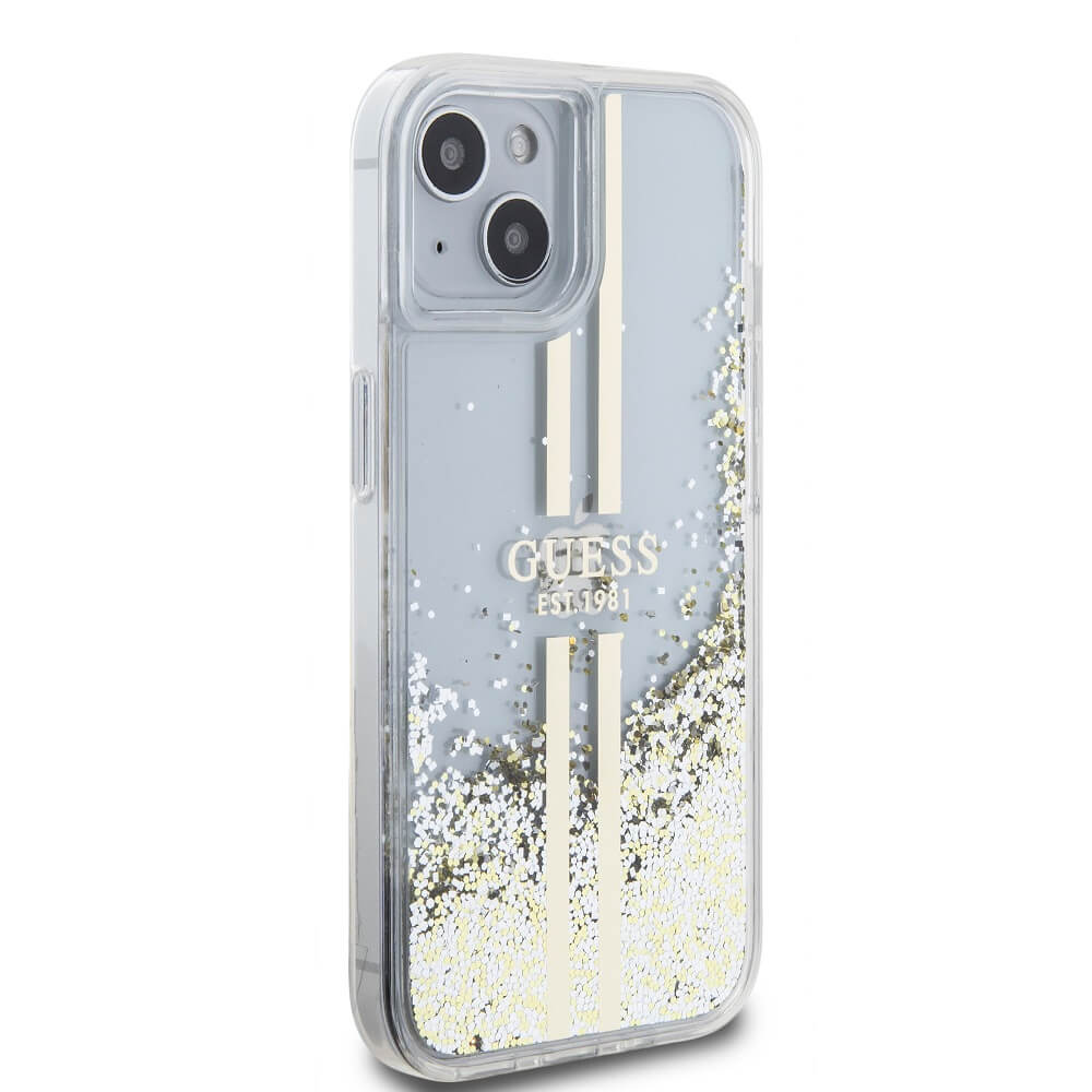 Guess Liquid Glitter Gold Stripe Case - дизайнерски кейс с висока защита за iPhone 15 Plus (прозрачен)