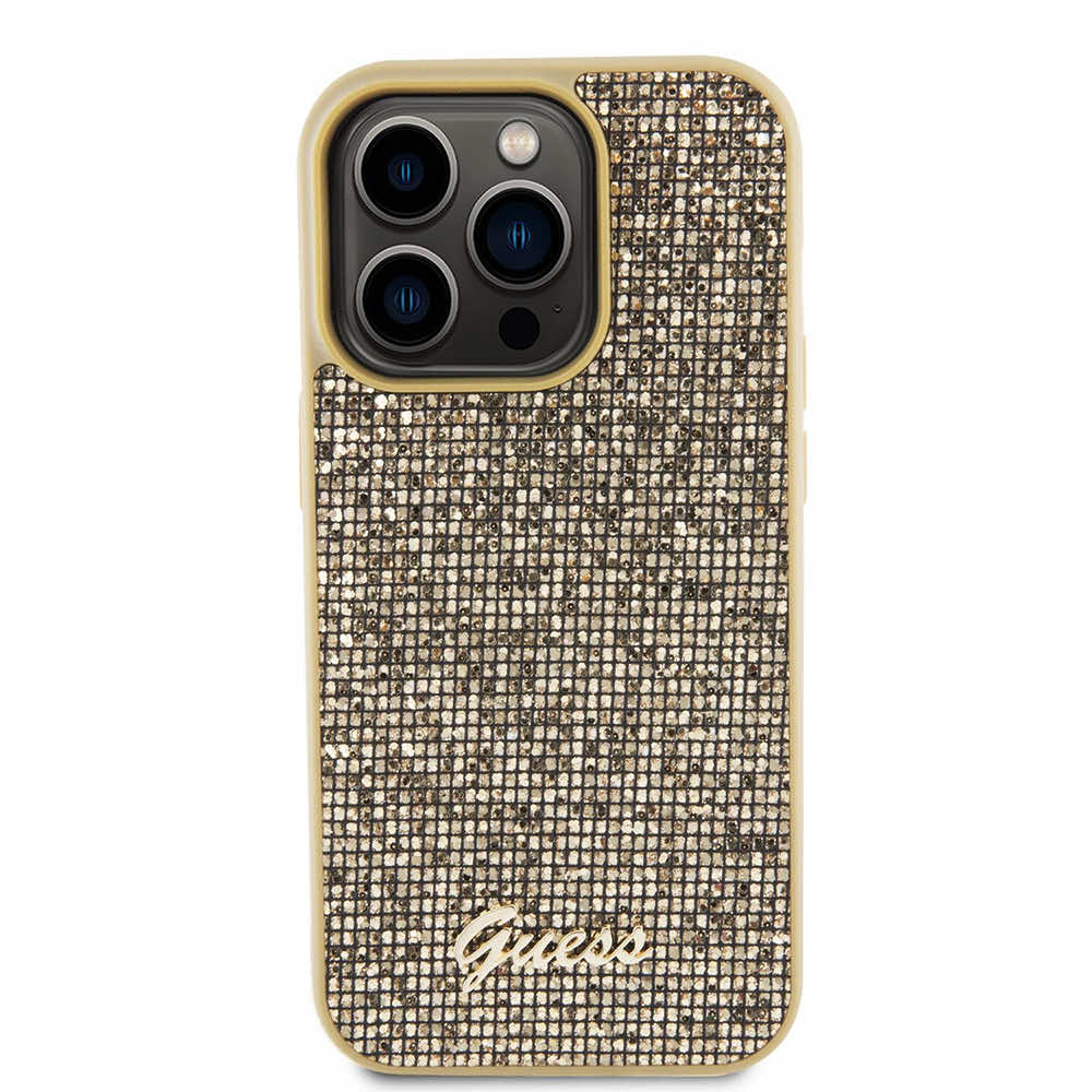 Guess PU Square Mirror Script Logo Leather Hard Case - дизайнерски кожен кейс за iPhone 15 Pro (златист)
