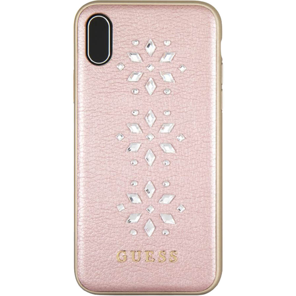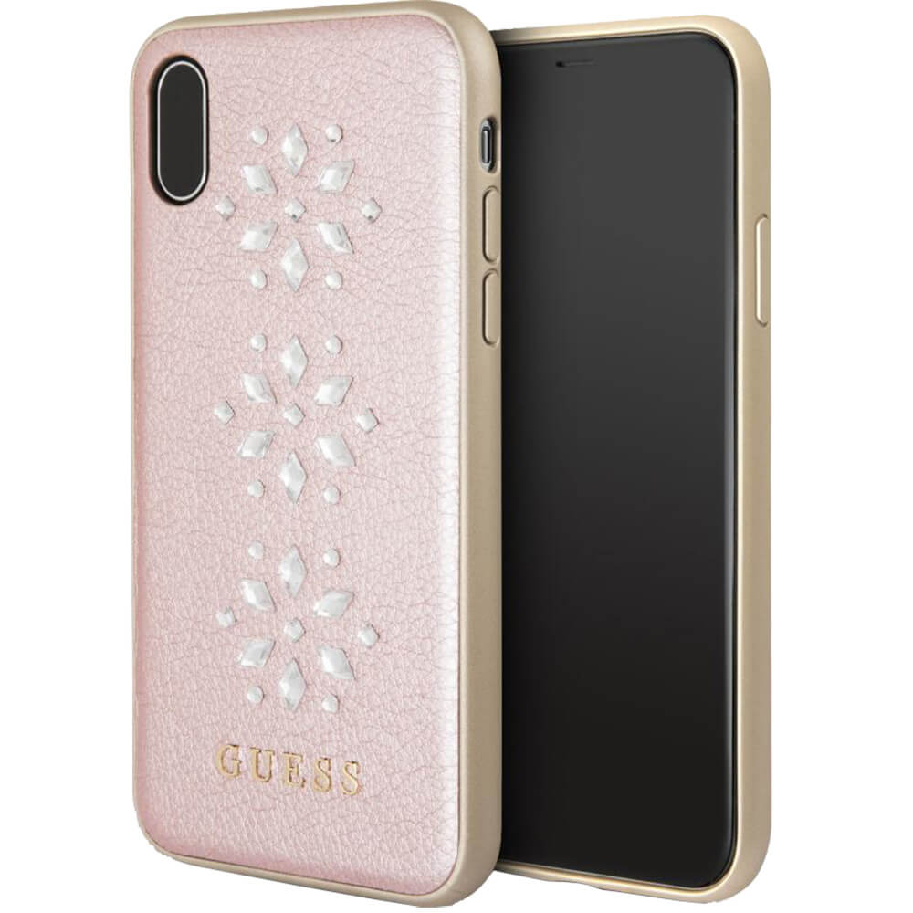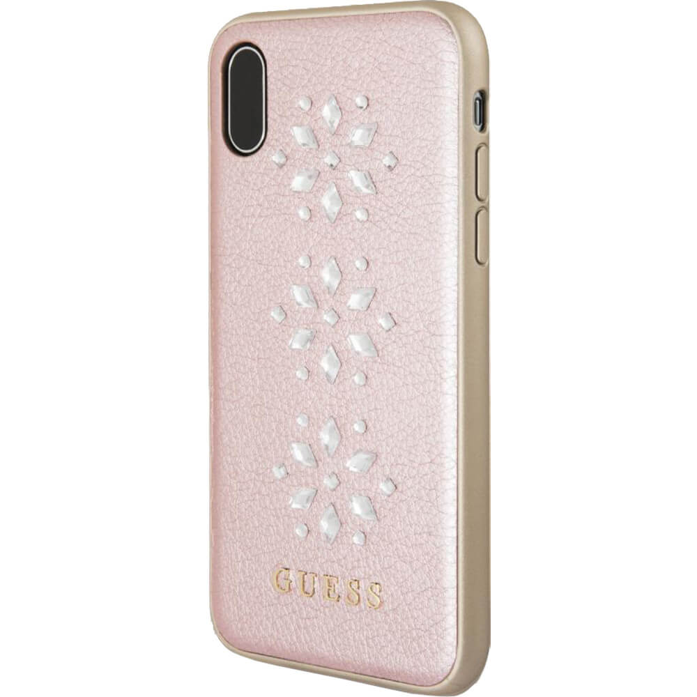 Guess Studs and Sparkles Leather Hard Case - дизайнерски кожен кейс за iPhone XS, iPhone X (розово злато)