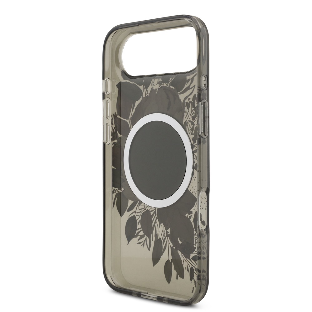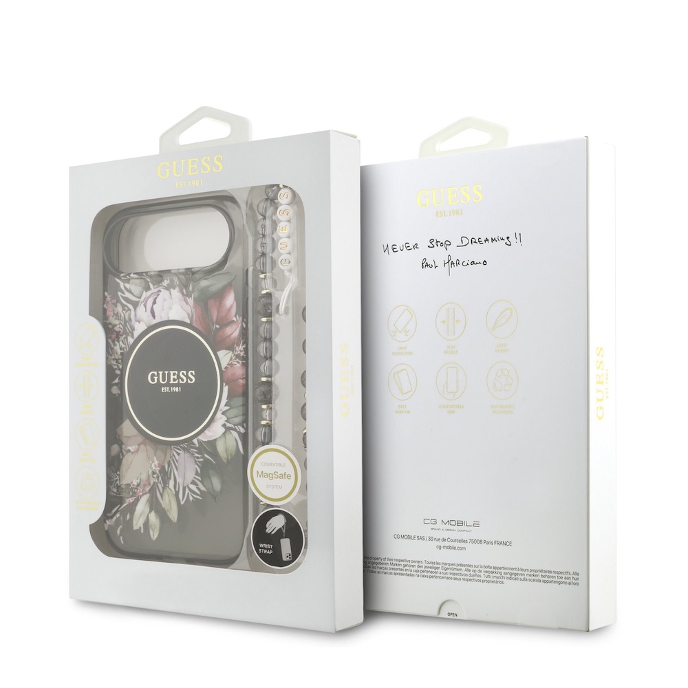 Хибриден удароустойчив кейс с MagSafe и връзка за ръка за iPhone 17 Air - Guess IML Flower Pearl Strap MagSafe Case (черен)