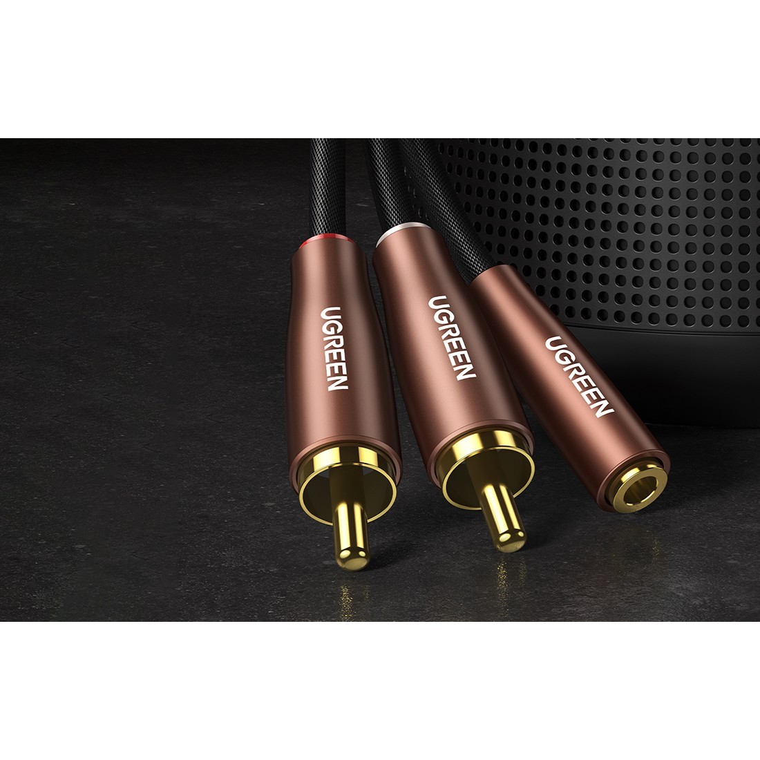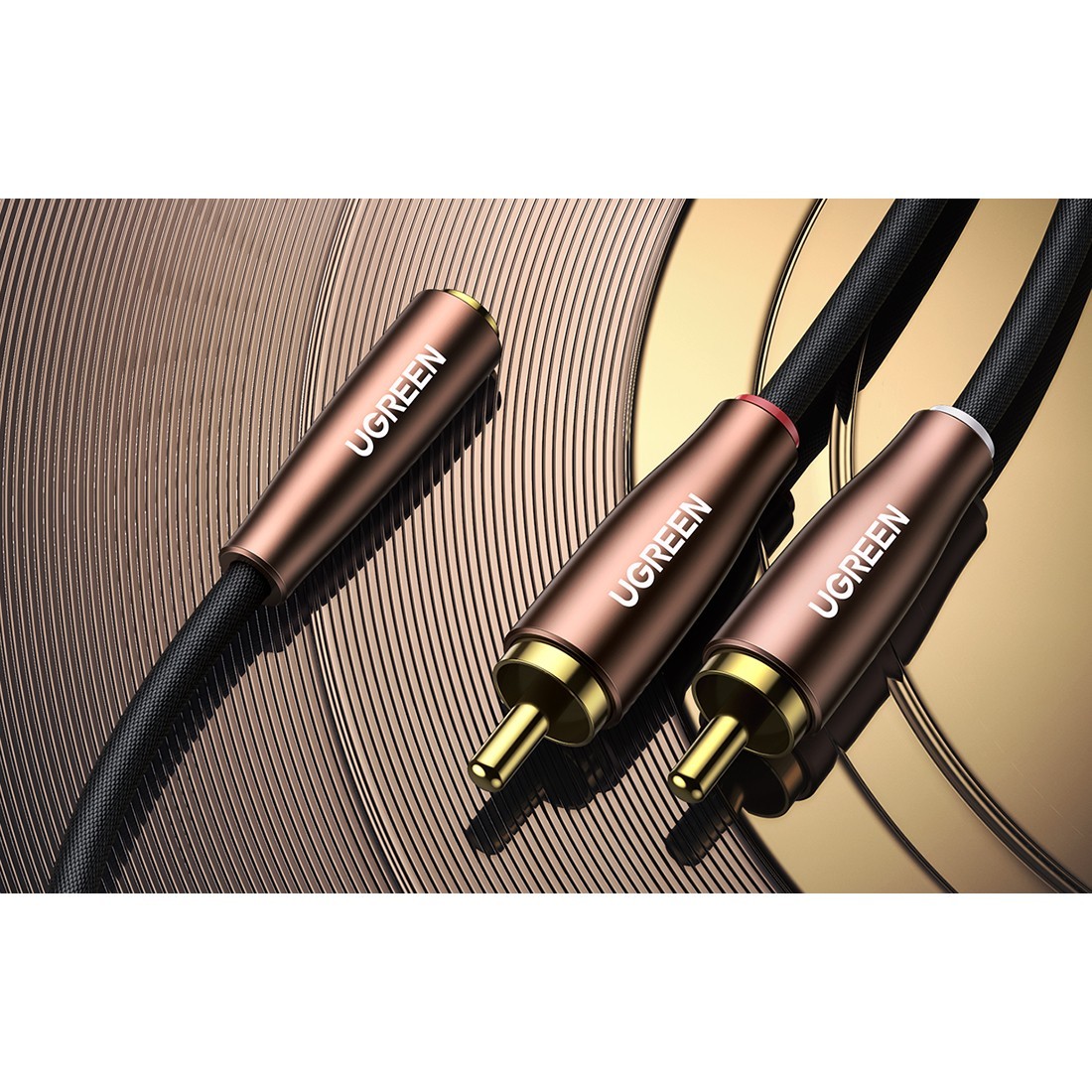 Качествен аудио кабел 2xRCA (мъжко) към 3.5мм аудио жак (женски) (100 см) - Ugreen AV198 2xRCA Male to 3.5mm Female Audio Cable (черен-кафяв)