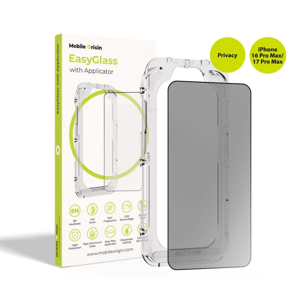 Калено стъклено защитно покритие с определен ъгъл на виждане за дисплея на iPhone 17 Pro Max, iPhone 16 Pro Max - Mobile Origin EasyGlass Privacy Full Cover Tempered Glass With Applicator