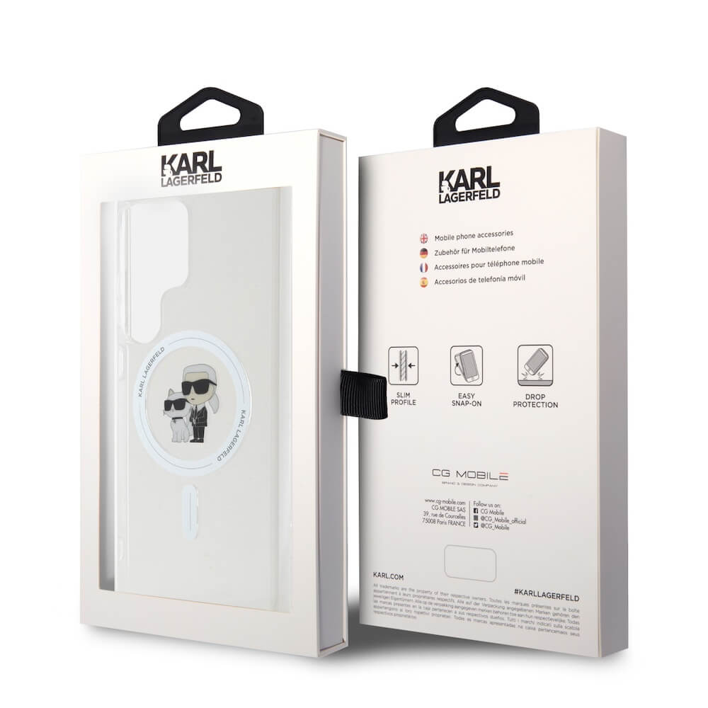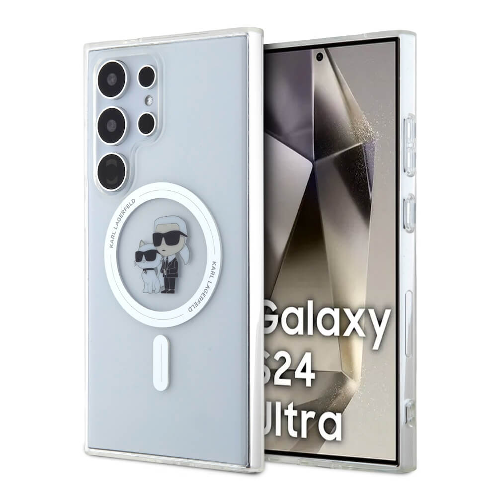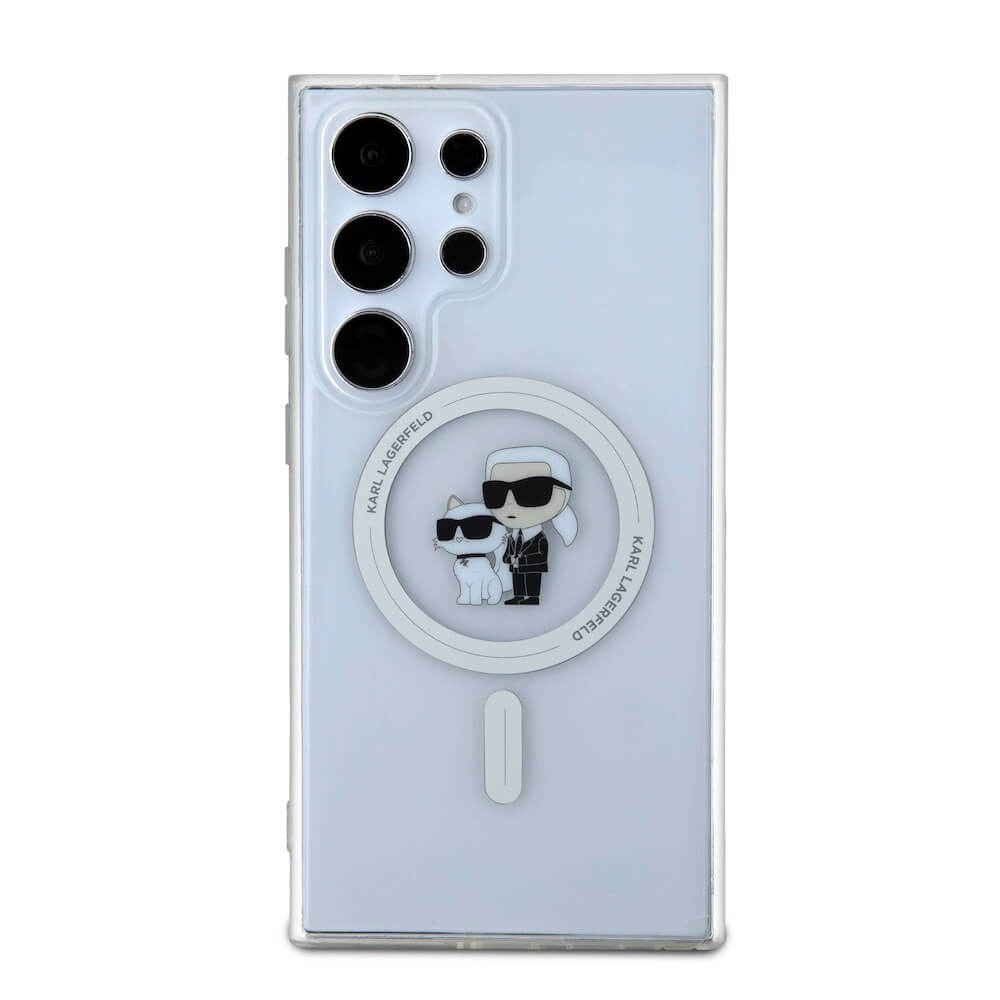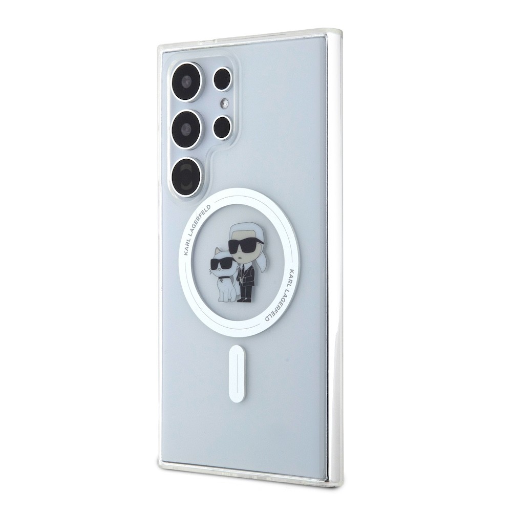 Karl Lagerfeld IML Glitter Karl and Choupette MagSafe Case - дизайнерски силиконов кейс с MagSafe за Samsung Galaxy S24 Ultra (прозрачен)