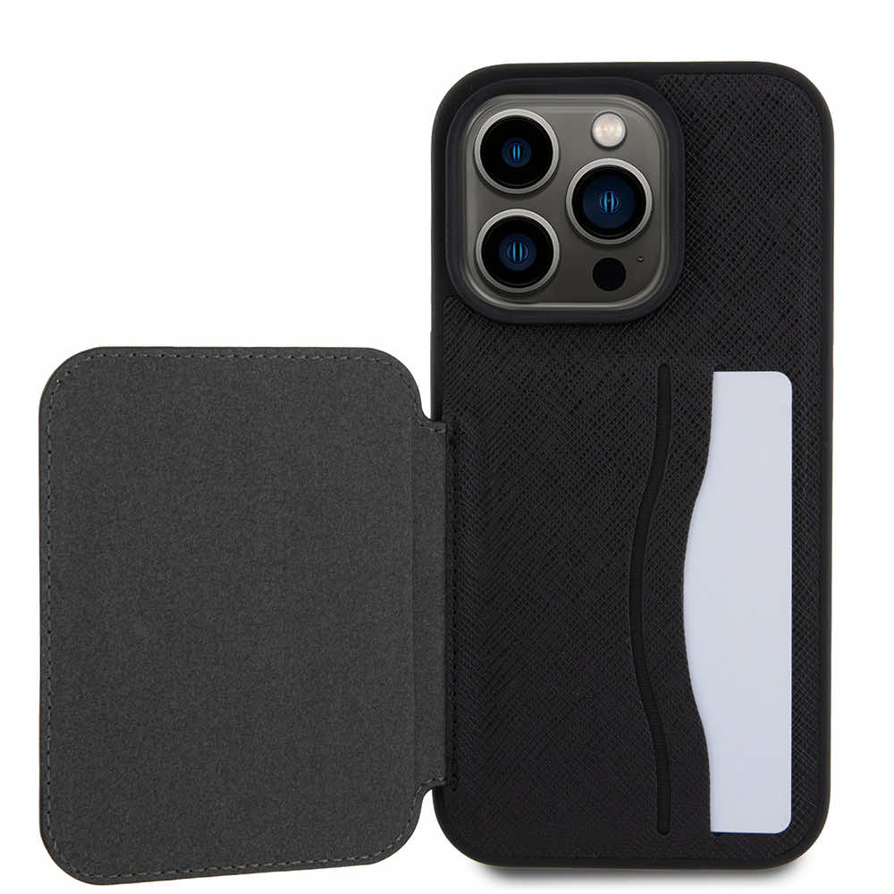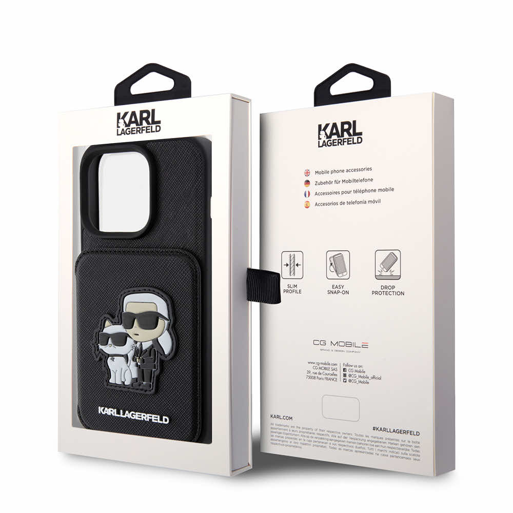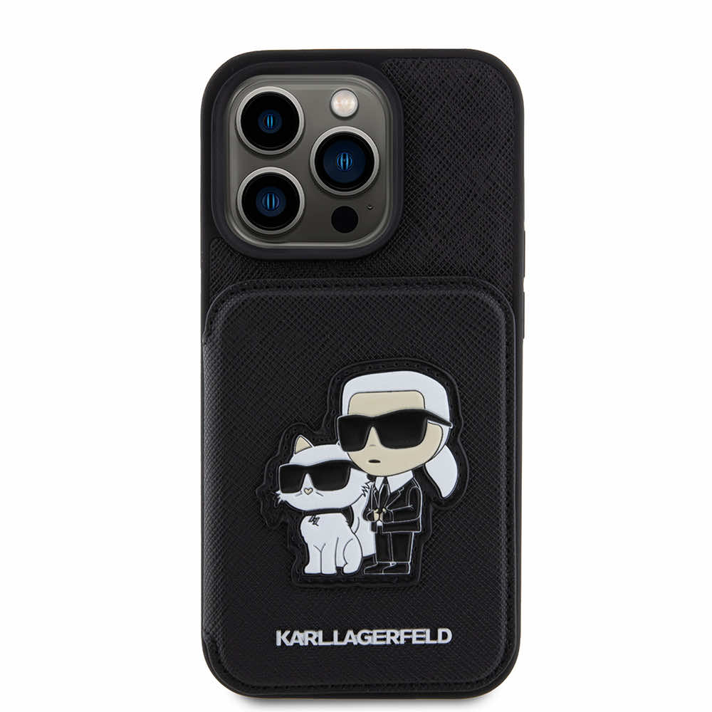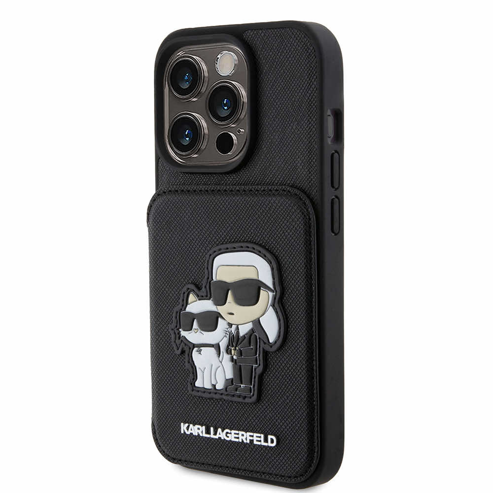 Karl Lagerfeld PU Saffiano Card Slot Stand Karl and Choupette Case - дизайнерски кожен кейс с отделение за карти за iPhone 15 Pro (черен)