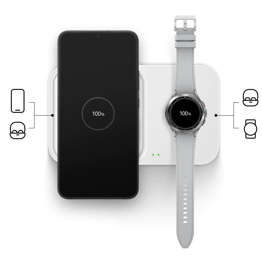 - Едновременно зареждане на Qi-съвместими устройства като смартфони, слушалки или Galaxy Watch. Това осигурява удобство и ефективност.