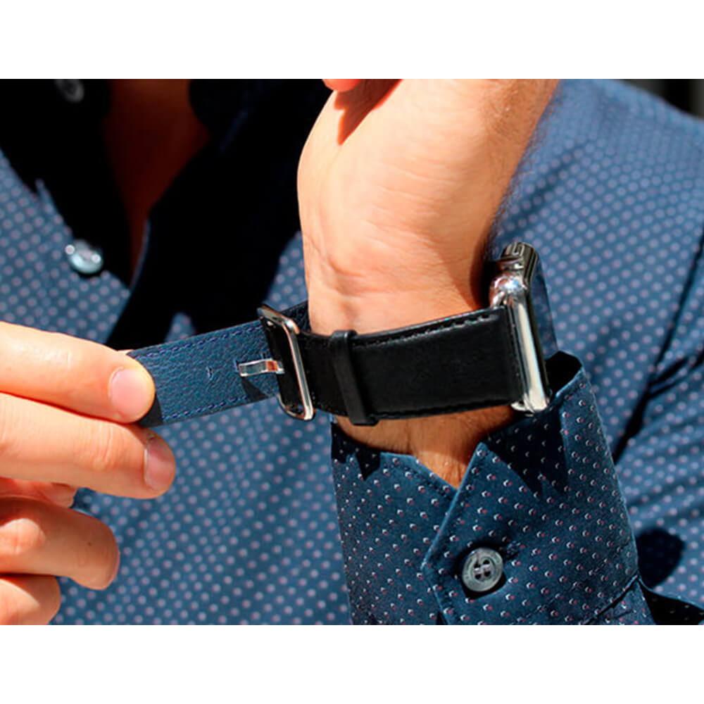 - Някои от снимките на продукта са с различен цвят на елементите за прикрепяне към Apple Watch. Обърнете внимание, че тази каишка е с ЧЕРНИ закрепващи елементи.
