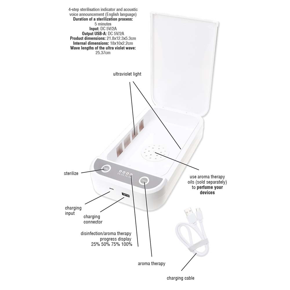 - Стерилизаторът може ефективно да стерилизира вашия смартфон и да премахне нежеланите микроби, бактерии и вируси чрез стерилизация с UV радиация