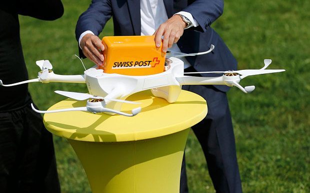 Шведските пощенски услуги са започнали тестове за доставка на колети от дронове и макар вече да са доста разпространени, едва ли ще заместят пощальоните в близките 5 години. Ръководителите на пощенските услуги показаха дроновете за първи път на 7 юли и съобщиха, че първоначалното тестване за доставка на машините ще продължи до края на месеца. Снежнобелите дронове се състоят от четири разклонения с витла на края, позиционирани на кух пръстен с размерите на тоалетна седалка, а в средата е поставена жълта кутия с логото на пощенските услуги. В изявление на Swiss Post, се казва, че изключително леката конструкция на дрона е способна да транспортира товари до 1кг на разстояние повече от 10км с едно зареждане на батерията.