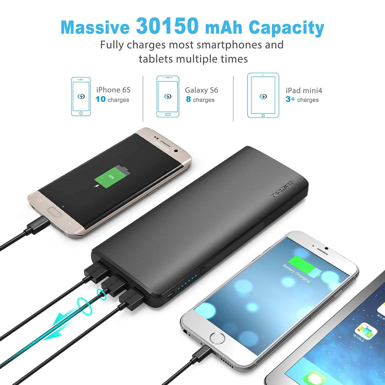 TeckNet Power Bank 30,150mAh е една от най-добрите външни батерии за зареждане в света и то с реален капацитет. Ако си се наситил на външни батерии, които са представяни за „преносими”, може би ще искаш да погледнеш TeckNet iEP3015, която представлява 30150mAh външна батерия с 3 USB порта. Цената на тази батерия е малко висока за батерия с такъв капацитет, но предполагаме, че причината е в дизайна и BLUETEK™ технологията за разпознаване на устройствата включени към нея.