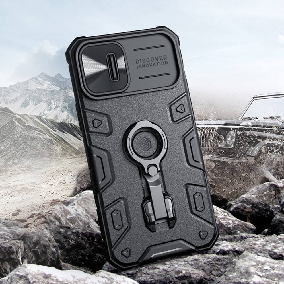 Nillkin CamShield Armor Pro Hard Case - хибриден удароустойчив кейс с пръстен против изпускане за iPhone 14 Plus (черен)