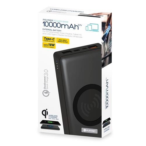 Platinet Power Bank 10000 mAh Dual Input Wireless Qi Charging - външна батерия с два USB и USB-C изходи и безжично зареждане (черен)