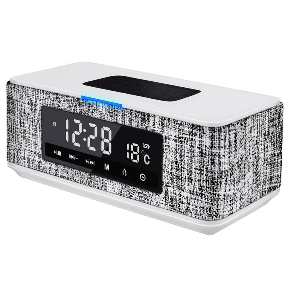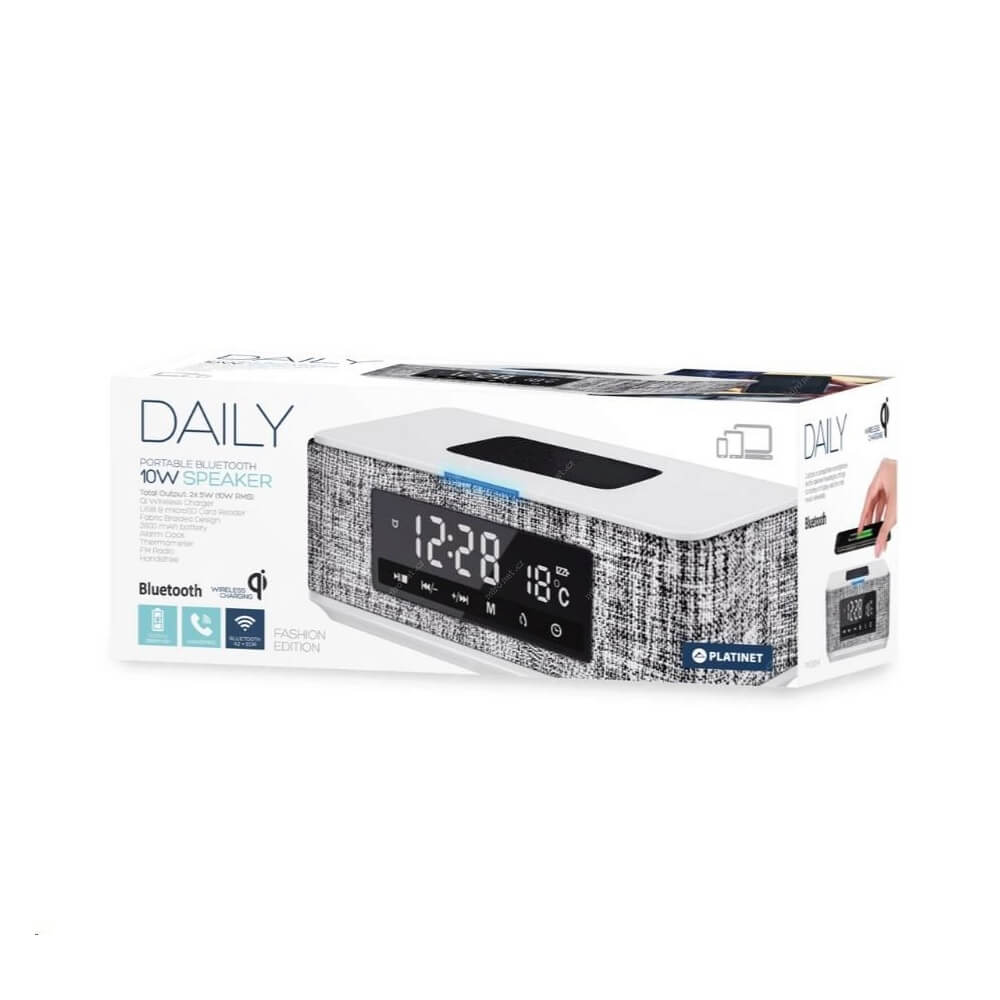 Platinet Speaker Daily Bluetooth, QI, FM And Clock - безжичен портативен спийкър с FM радио, часовник с аларма и поставка за безжично зареждане (бял)