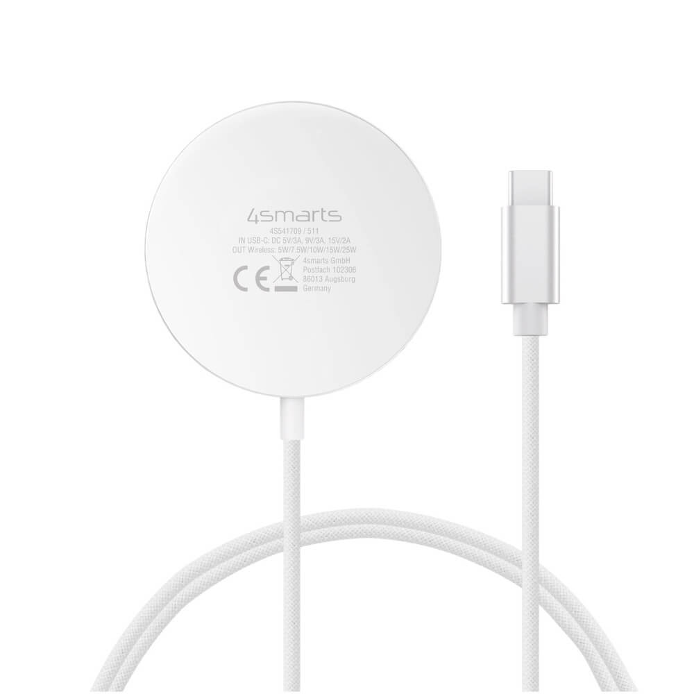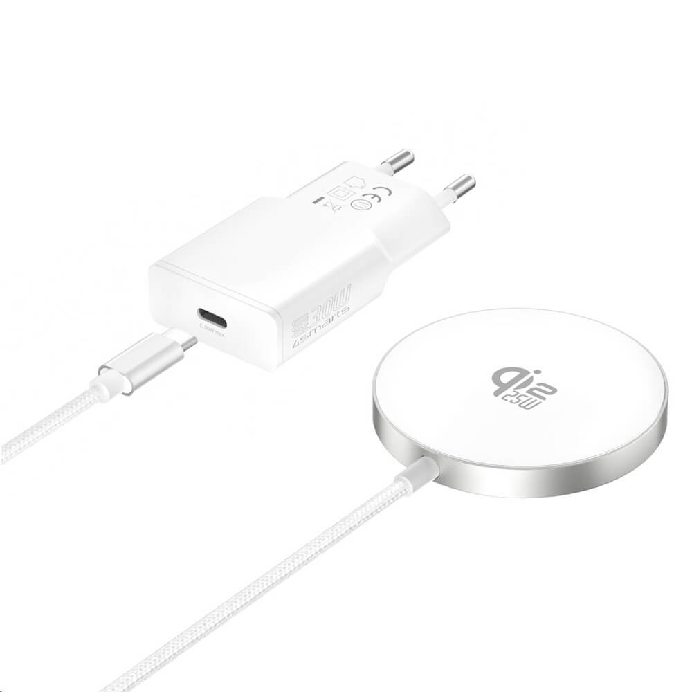 Поставка (пад) за безжично зареждане и захранване за ел. мрежа за iPhone с Magsafe - 4smarts Qi2 USB-C Magnetic Wireless Qi Charger 25W With 30W Wall Charger (бял)