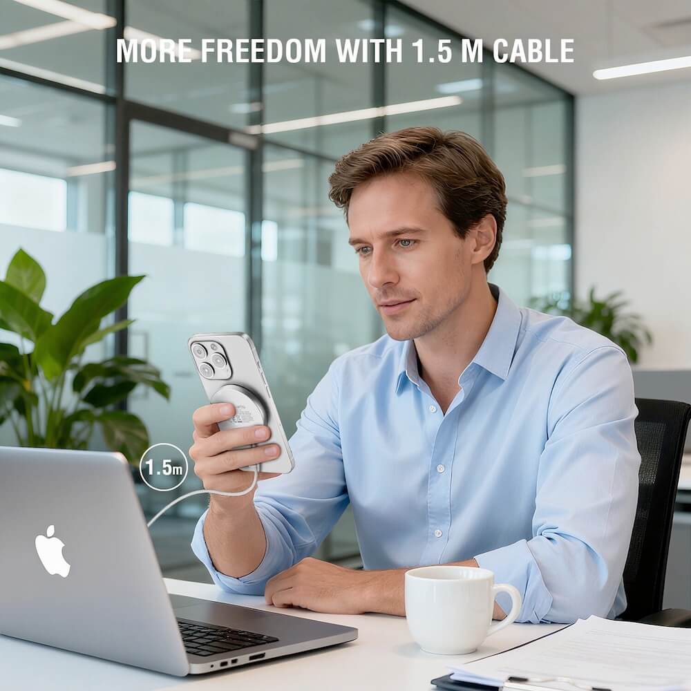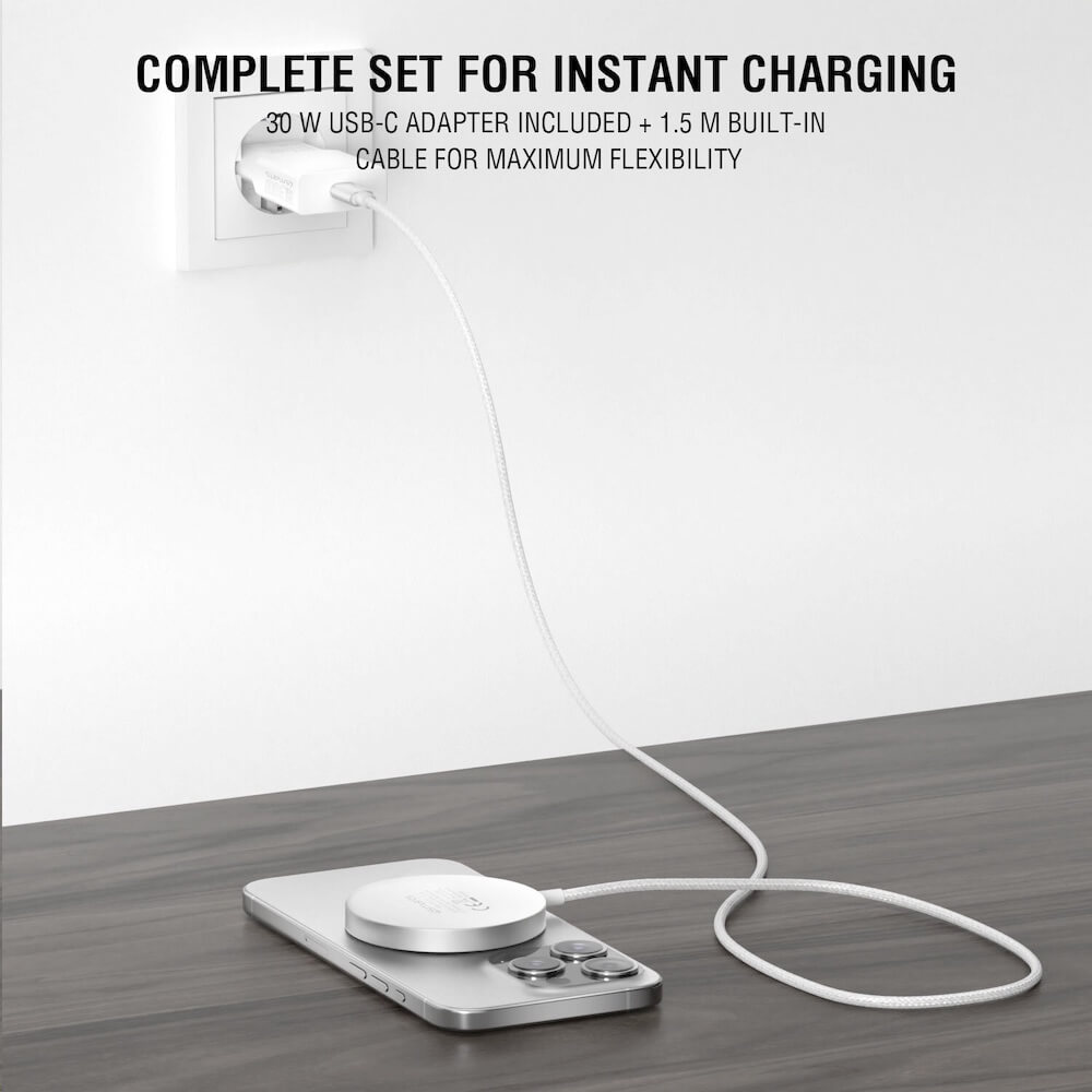 С Qi2 зарядното устройство можете да зареждате вашия iPhone с MagSafe без усилие. Включеният 30W захранващ адаптер гарантира бързо зареждане, а интегрираният USB-C кабел с дължина 150 см осигурява удобство при използване.